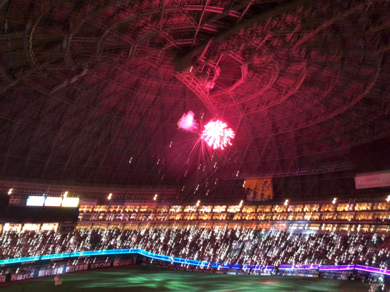 - 試合後の花火もドーム内で見ごたえありました