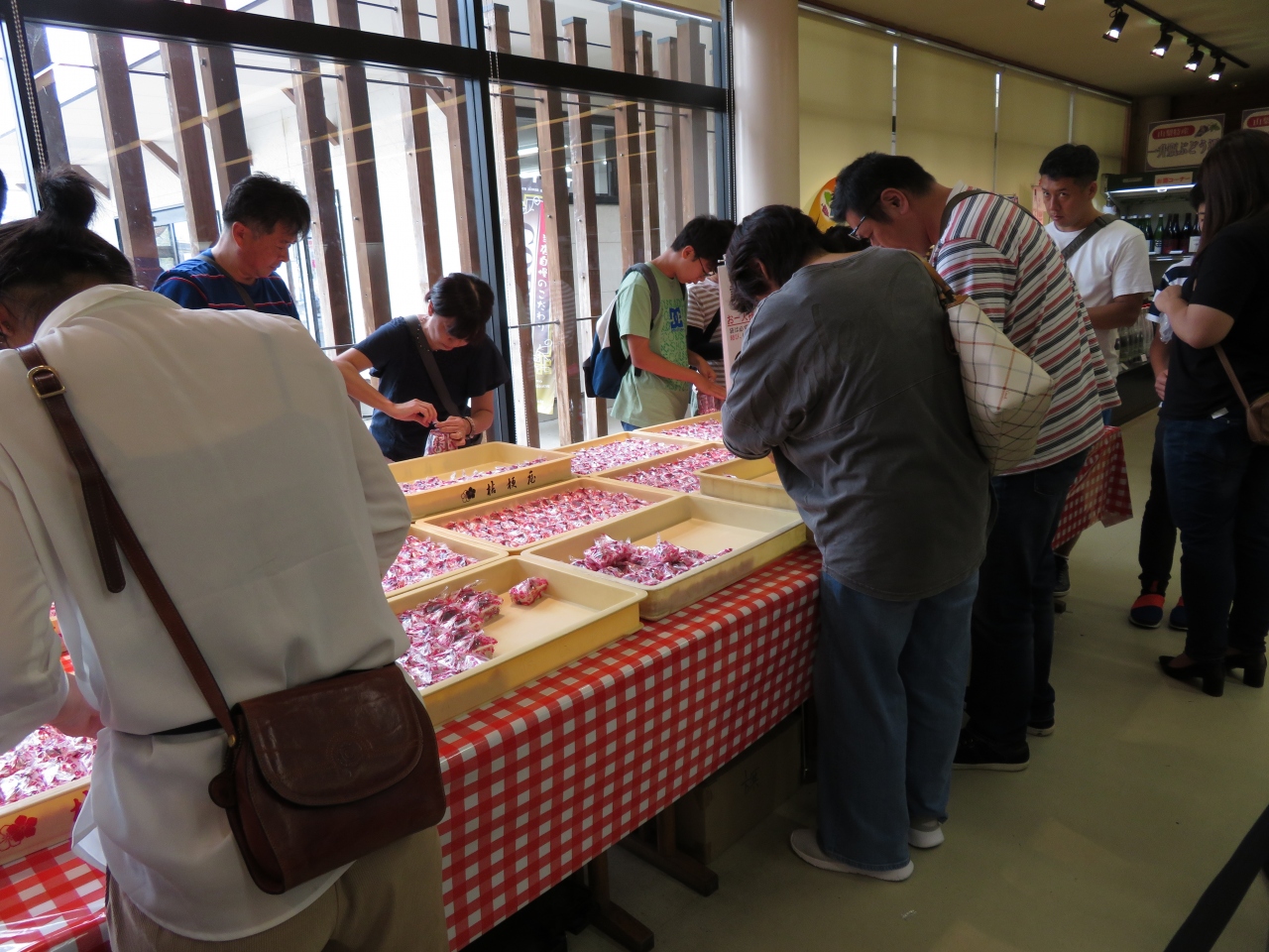 一番のお目当ては工場アウトレット社員特価販売1/2。ここでは賞味期限の迫った商品や形の崩れた商品など、味や品質には問題のないアウトレット商品が3割引から半額で販売されています。意気揚々と店内に入りましたが、時すでに遅し。オープンから1時間程で人気の信玄餅は当然ながら、その他の商品も殆ど売切れていました。私たちは何も考えず工場見学を先にしてしまった事もあり、かなり出遅れてしまいました。アウトレットに行く場合はオープンと同時に入店した方が良いと思います。