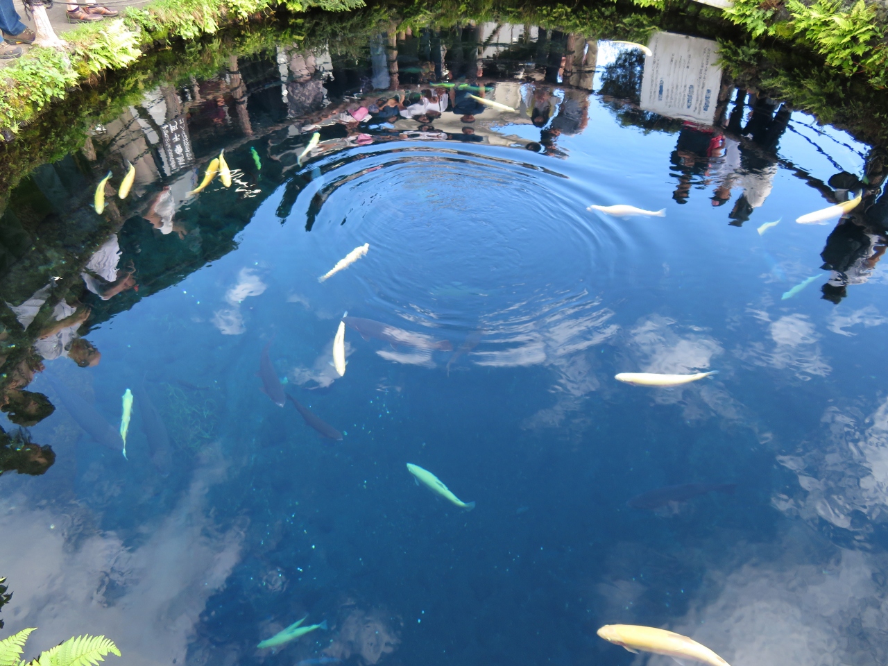 池の水はそれぞれ深さの違いからか、透明度が高く蒼が際立っている池や、中には濁りが強く病気じゃないかと思われる鯉がいた池もありました。訪れた日は曇りがちで富士山を見る事はできませんでしたが、数十年ぶりに訪れた忍野八海はとても見ごたえありました。