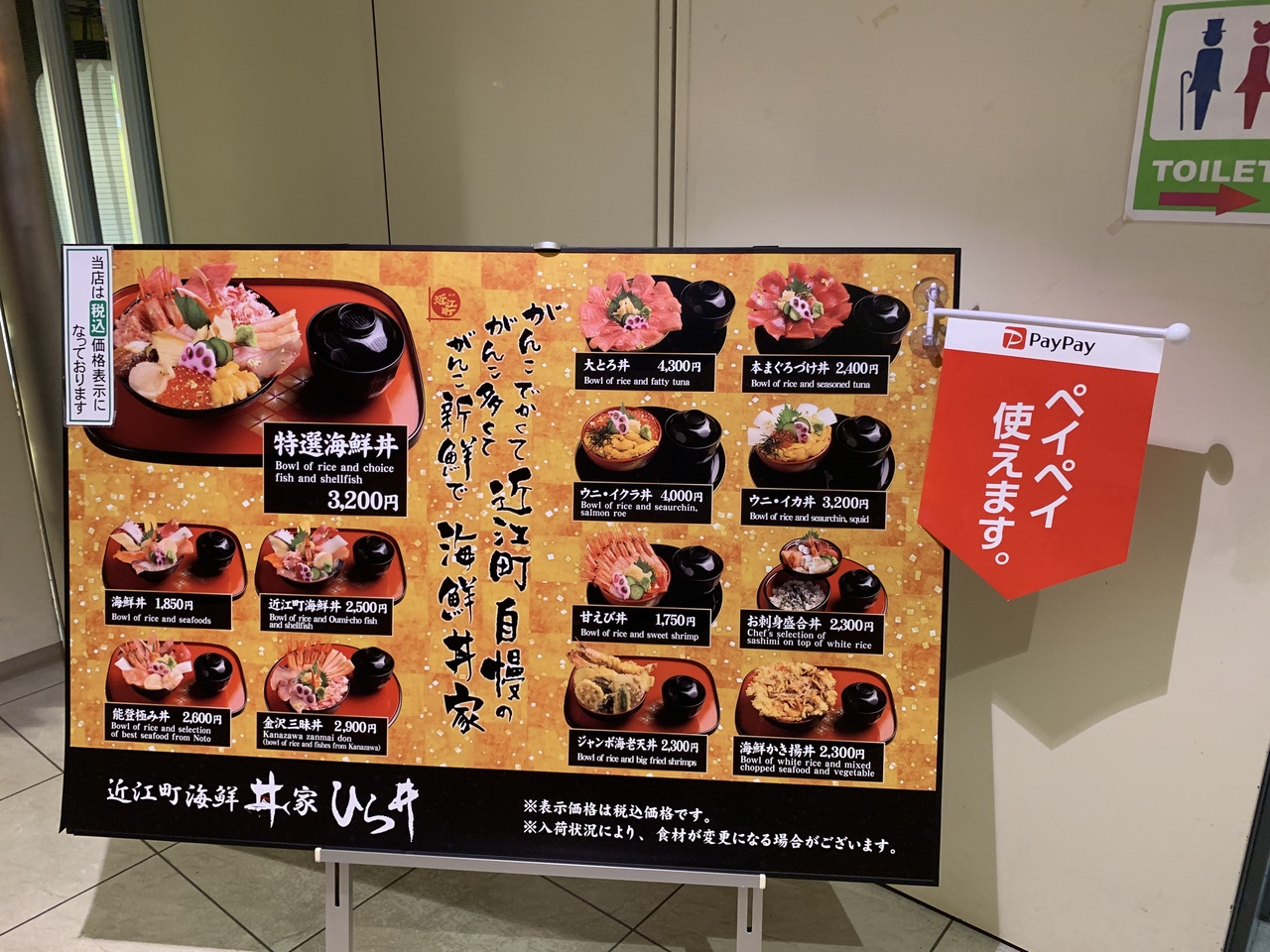 海鮮丼を食べに近江町市場に行きました。近江町市場には海鮮丼が食べれる様々な店がありますが、それなりに値段はします。そして12時には観光雑誌に載っている有名な店は大行列になるのでそのような店に行くなら11時頃に行くべきです。また、近江町市場はその場で食べれるような魚貝類も売っています。先週大阪の黒門市場で暴利的な価格を見ていたので近江町市場は比較的安いような感じがしましたが観光客価格です。