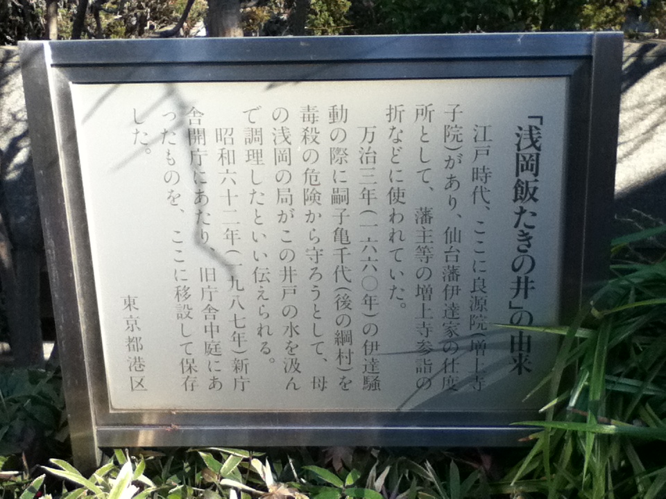 港区役所の正面玄関の近くに浅岡飯炊きの井戸の石碑と説明板がある。石碑には名称が刻まれている。お勧めの点は、江戸時代ここに良源院(増上寺子院)があり仙台藩伊達家の支度所として利用されていたこと、万治3年(1660)の伊達騒動の際に嗣子亀千代を毒殺の危険から守ろうとして母の浅岡の局がこの井戸の水を汲んで調理したといい伝えられていたこと、石碑の前には井戸をイメージしたモニュメントがあることである。訪問時の感想は、江戸前期の三大お家騒動の一つ、伊達騒動や仙台藩4代藩主となる亀千代(後の伊達綱村)に関わる井戸がここにあったことを初めて知り、またこれを機に仙台藩や伊達騒動について理解を深めることができ訪問して良かった。