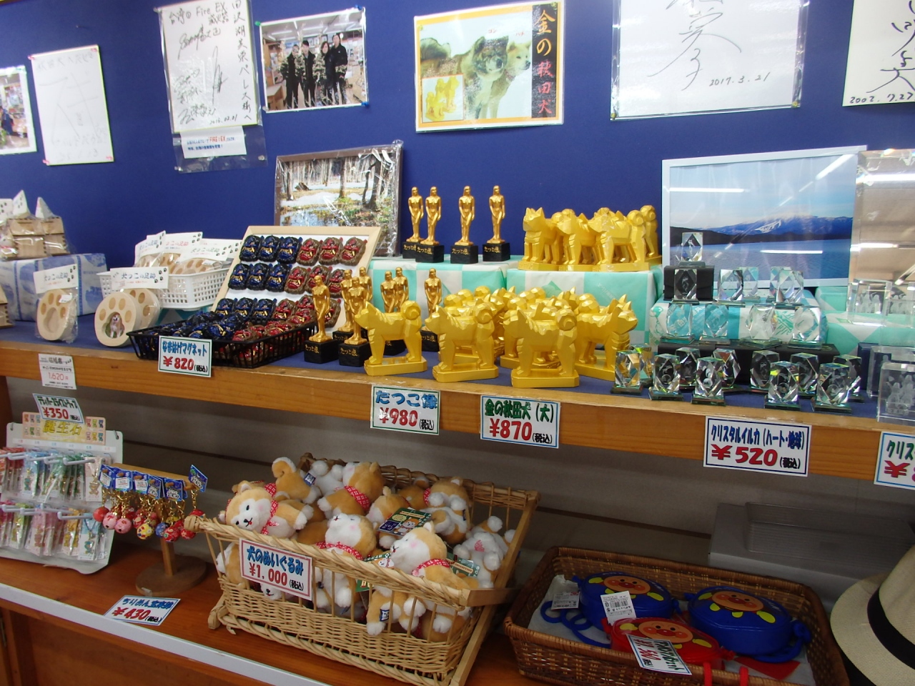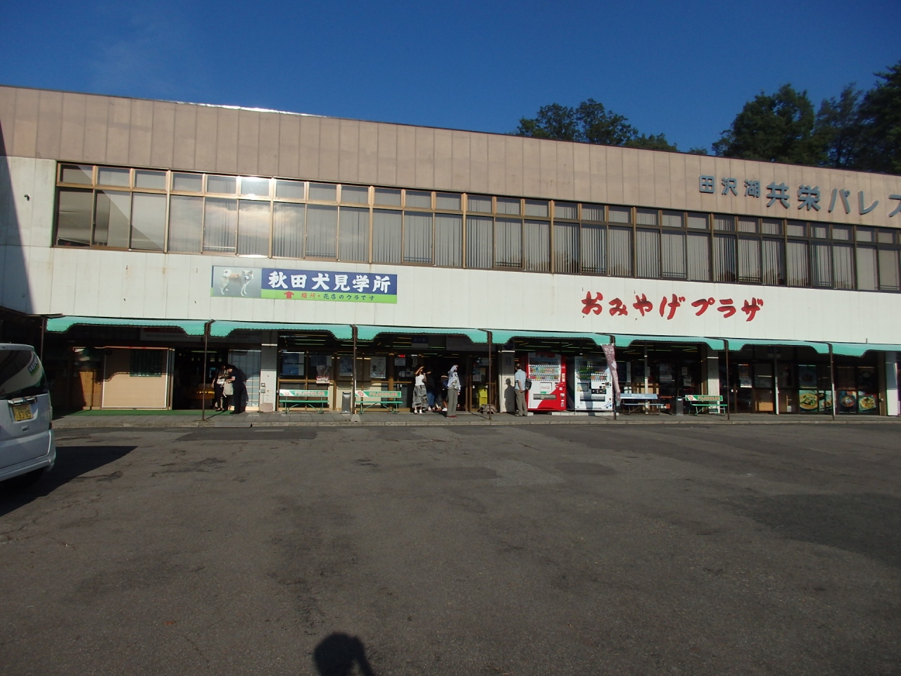 辰子像から湖周を車で走って岩手県雫石へ向かう途中に、おみやげショッピングをしました。駐車場が表にも裏にもとても広かったのですが、建物の中もとても広く、秋田犬や辰子姫のグッズや関係のお菓子、きりたんぽなど、秋田名物がたくさん売っていました。稲庭うどんなどを食べるコーナーもありました。