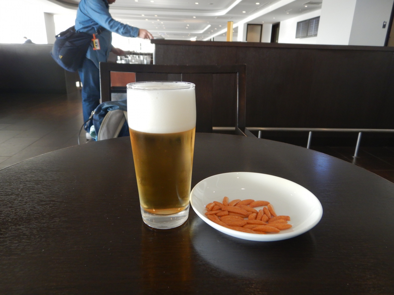 午後3時前の時間はあまり混雑していないのでよかった。サッポロ黒ラベルかキリン一番搾りの生ビールが飲めるのがありがたい。外から食べ物を持ち込むことはしたくないので、つまみはおかきだけで我慢のする。前回と同じく、外の景色を見たり、新聞を読んだり、Wi-Fiを利用してインターネットにパソコンを繋いで利用したりして過ごした。
