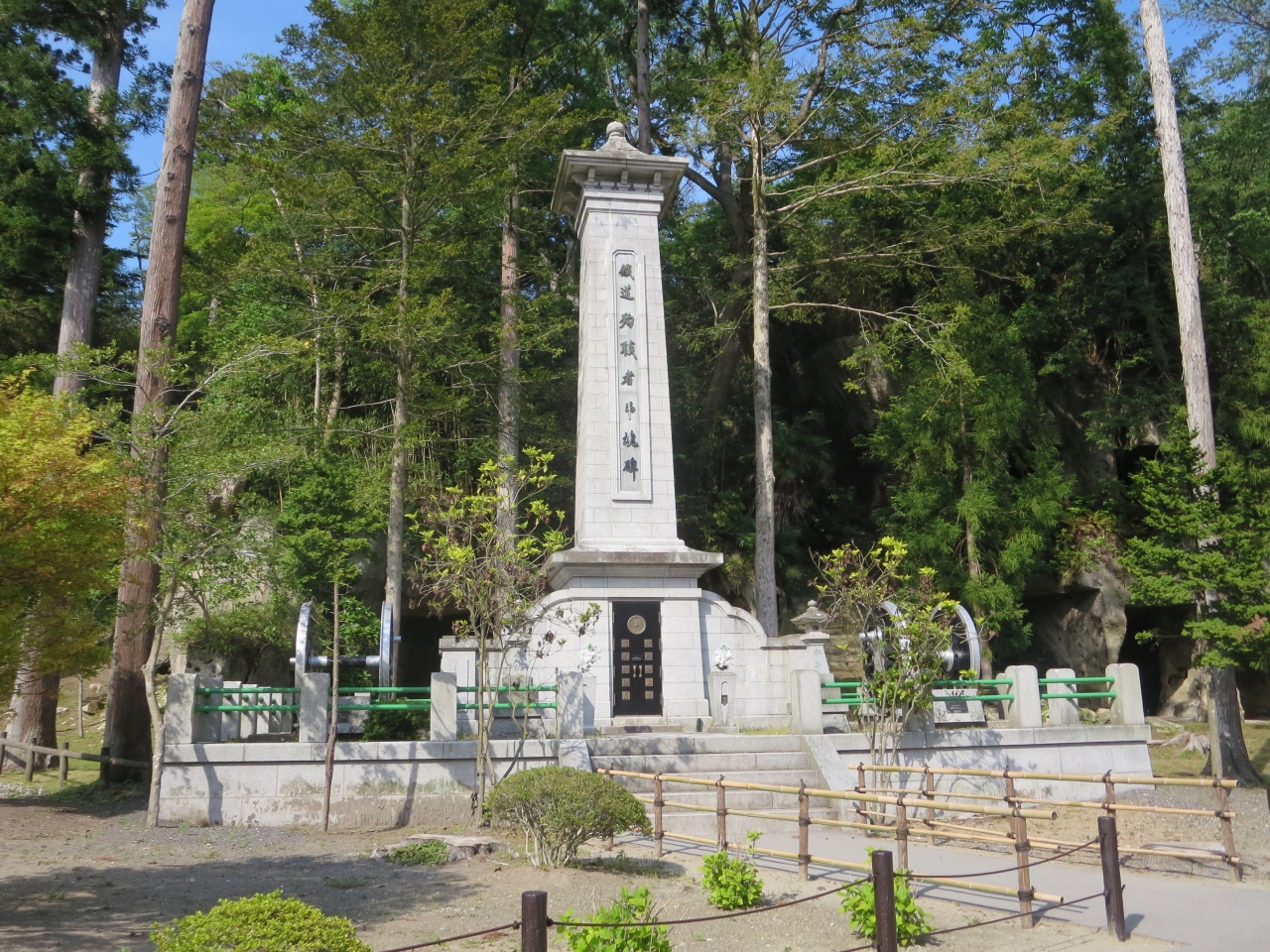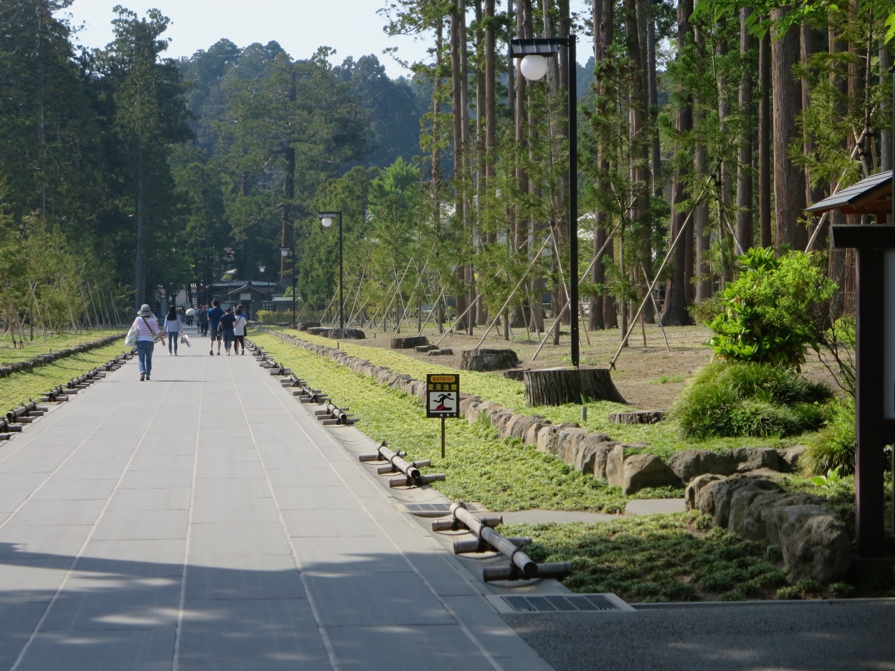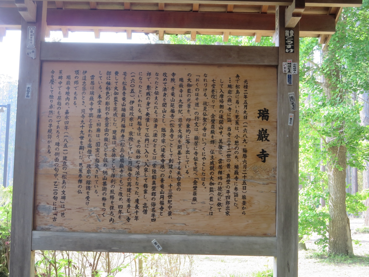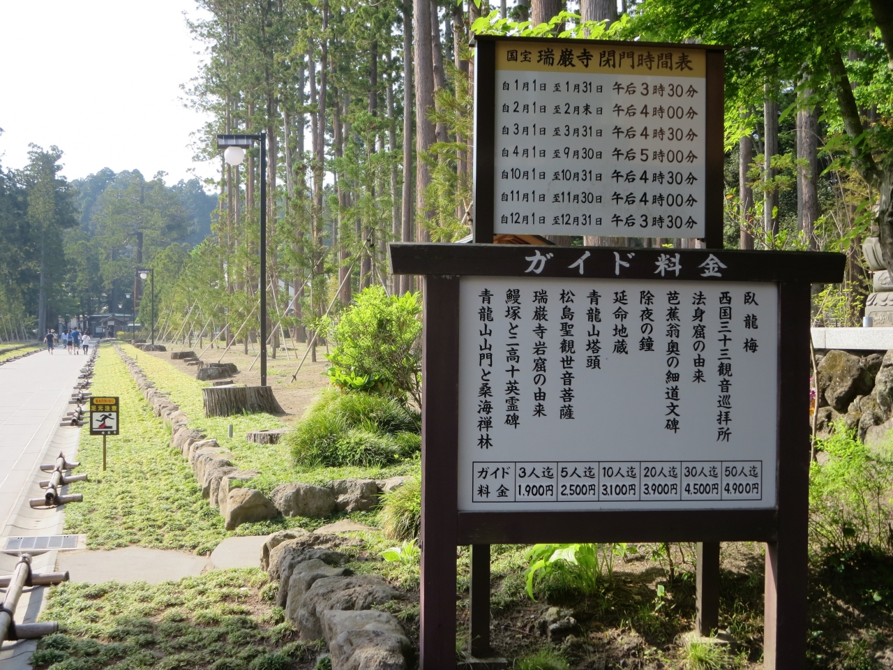 松島湾を船で回った後、駅に戻る途中に国宝瑞巌寺と描かれた大きな石柱があり、そこから参道に続いています。総門をくぐると正面に杉並木に囲まれた真っ直ぐな参道が目に入ります。参道の横には断崖があり、多くの洞窟が掘られ、石碑や石仏が置かれていて参道を真っ直ぐ進むよりも雰囲気のある通路になっています。