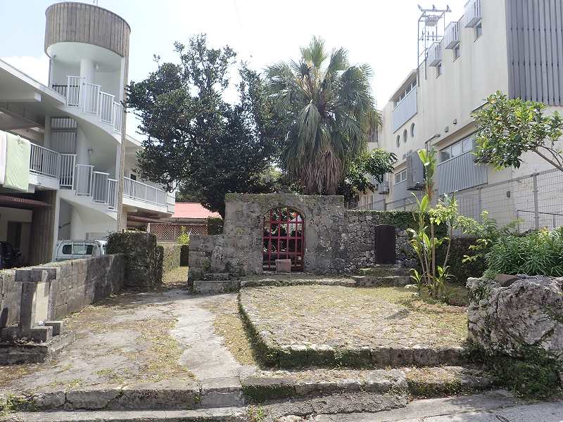 首里の旧県立博物館の脇の道を入って少し歩くと、右側にある。このあたりを散歩していて、遭遇したのだ。そばに説明板があり、「安谷川獄」という名前で、「アダニガーダキ」とふりがながしてあった。琉球王府時代の高級女性神官がつかさどる御嶽だったそうだ。アーチ門が配殿の役目をし、左右の石垣が境内を内と外にわけているそうだ。