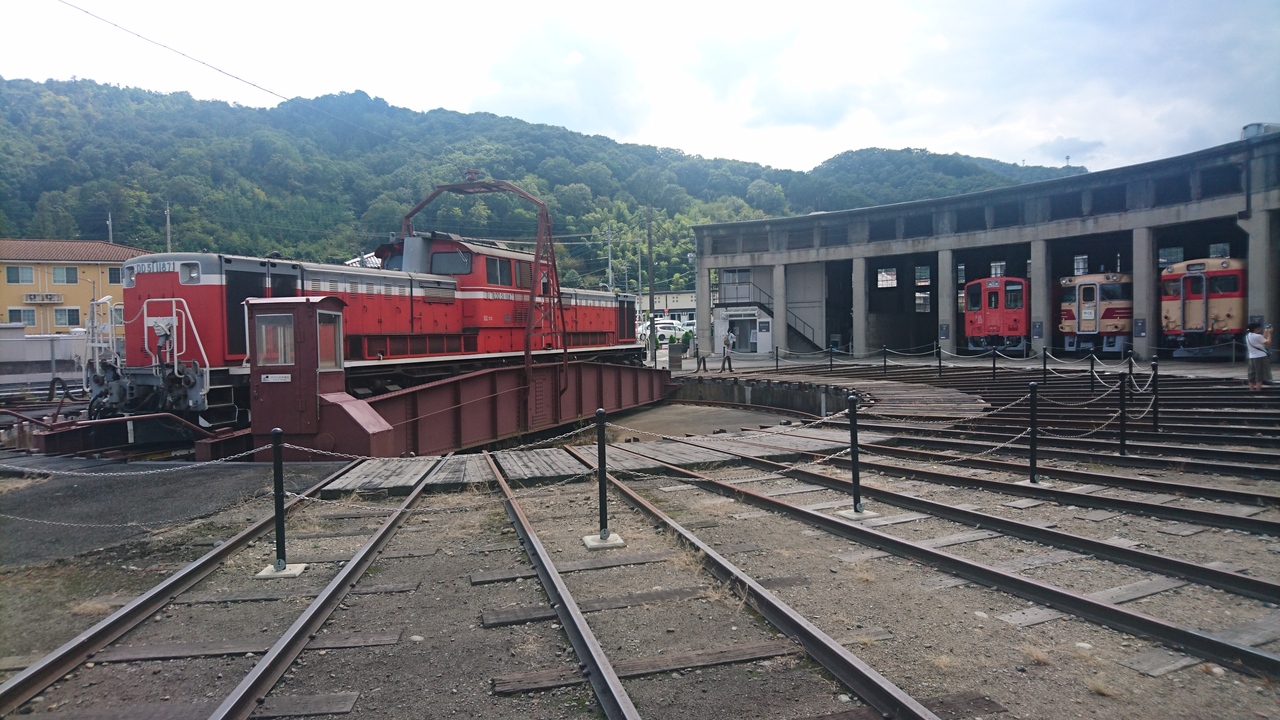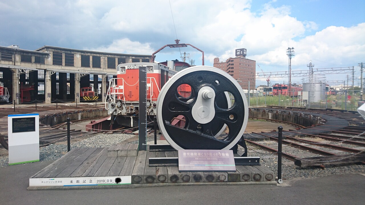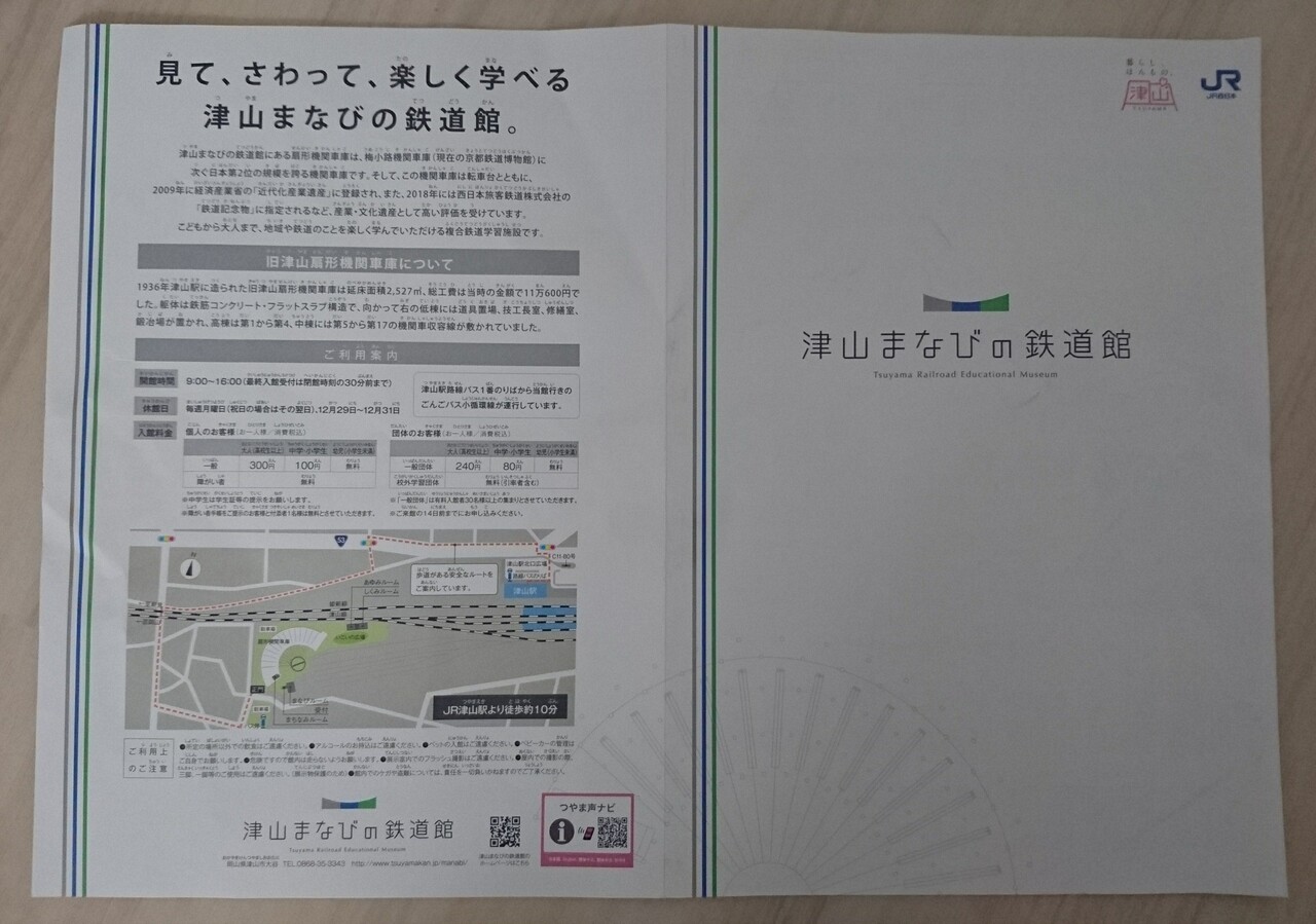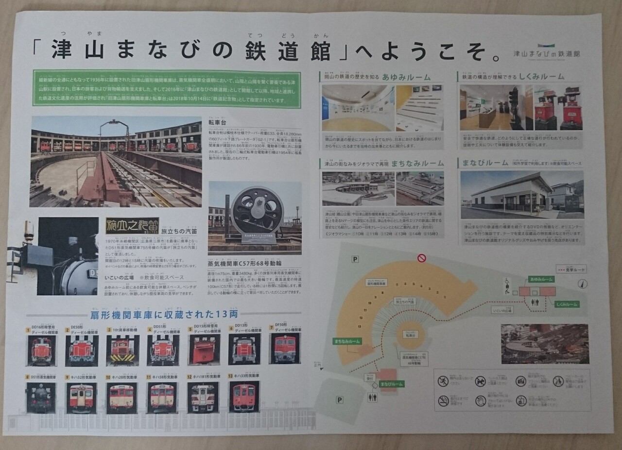 津山駅の裏手にある津山まなび鉄道館。入場料は大人300円だがJAFカード提示で1割引され240円。子供に分かりやすくパンフレットにもふりがながふってある。まちなみルームでのジオラマでは津山の1日を紹介。先に訪れた美作河井駅や松ぼうき橋梁も紹介された。まなびルームにはお土産も売っている。あゆみルームとしくみルームは子供が体験できるコーナーあり(係りの方がいらした)全体的にこじんまりとした造りだが機関車が13両収納されている扇形機関車庫は見応えあり。
