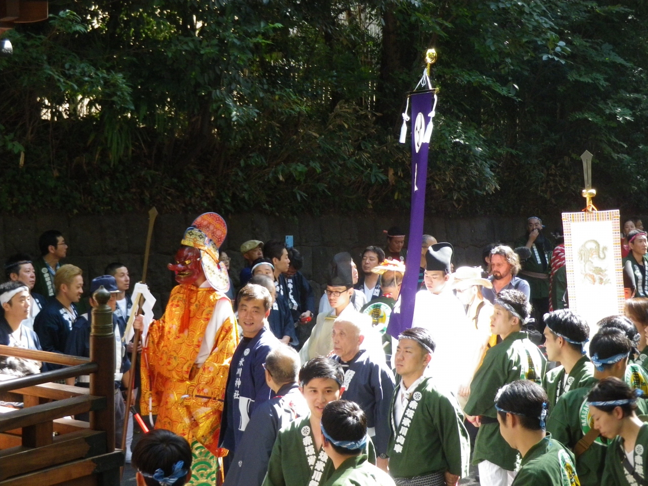 山車巡行は単に神社隊列を先頭に山車3本が道を進むだけで、何か特別なことが起こるわけではないのだが、その中で、細い道の電線をくぐる山車と狐役は注目ポイント。また、赤坂芸者さんを間近で見られて眼福だった。