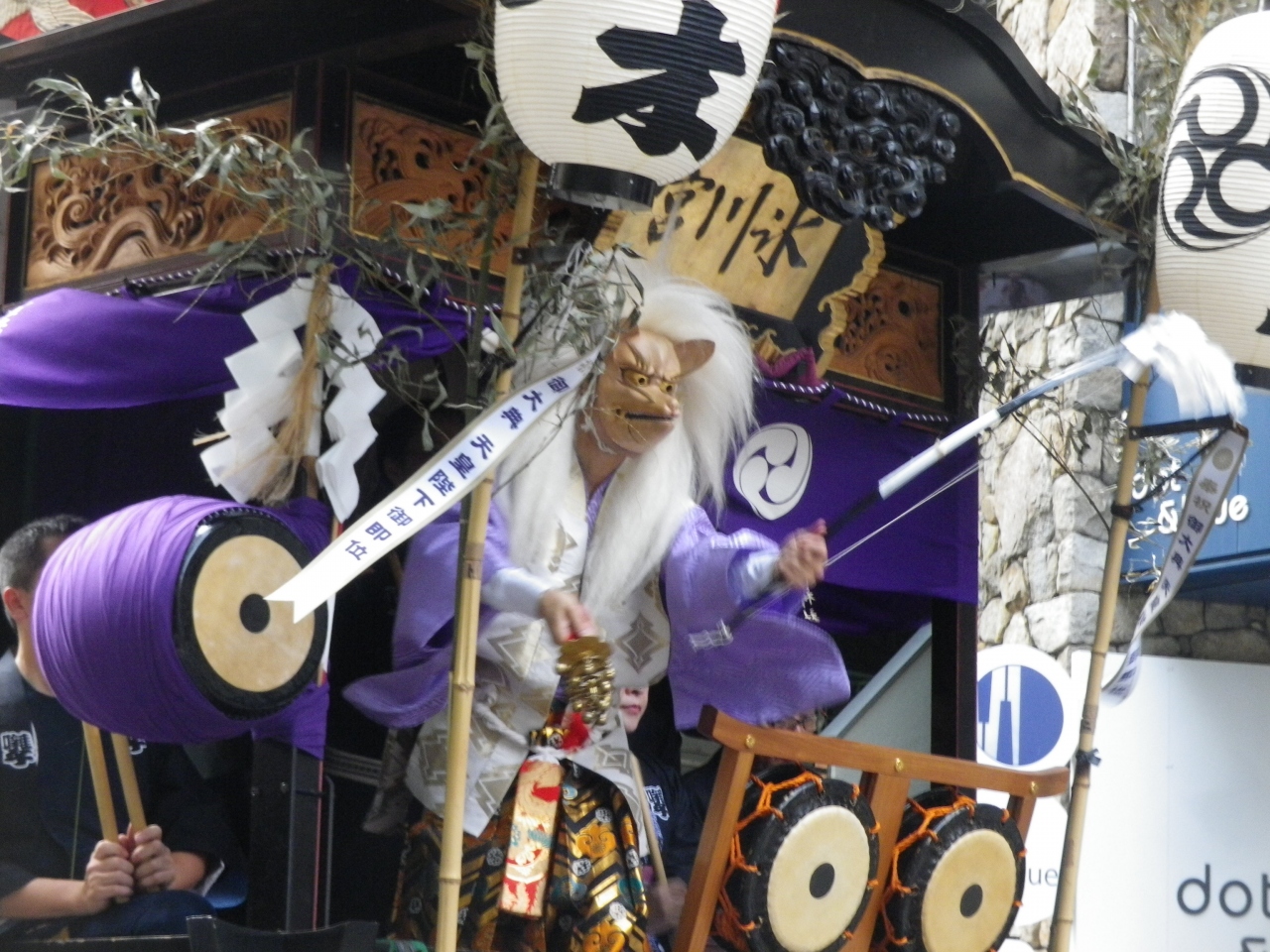 見ていて面白かったのは2本目の山車「頼朝」に乗っていた狐役。神職の方なのだろうか、歌舞伎の連獅子のような白い髪をつけ、狐面を被り、派手目な裃を着て、手には御幣・鈴・弓矢などを持ち替えてお祓い(?)をしてゆく。
