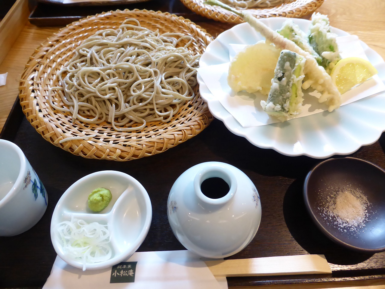 ランチで訪問。外観からは蕎麦屋とは思えぬ洒落た建物です。15分ほど待って入店。テーブル席に案内されました。空席はありましたが、提供が追いついていないので店外で待たせているようです。注文したのは生粉打ちの野菜天せいろと桜海老かき揚げせいろ。20分以上待ち提供されました。生粉打ちの蕎麦のいい香りもあり、コシも十分。のどごしも良くおいしい蕎麦です。野菜天は新玉葱、ズッキーニ、春菊、葉生姜。カラリと揚がっていて塩で頂くと野菜の甘みを一層感じます。桜海老かき揚げも衣のサクサク感と共に桜海老の香ばしさ、旨さが一段と感じられ絶品でした。ただやはり値段が高いのがネックでコストパフォーマンスで言えばかなり悪いです。