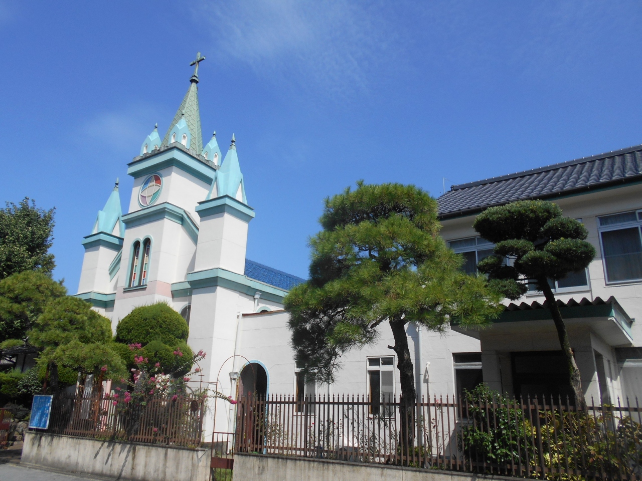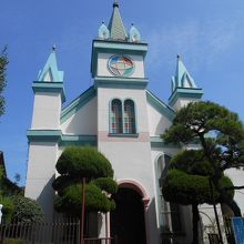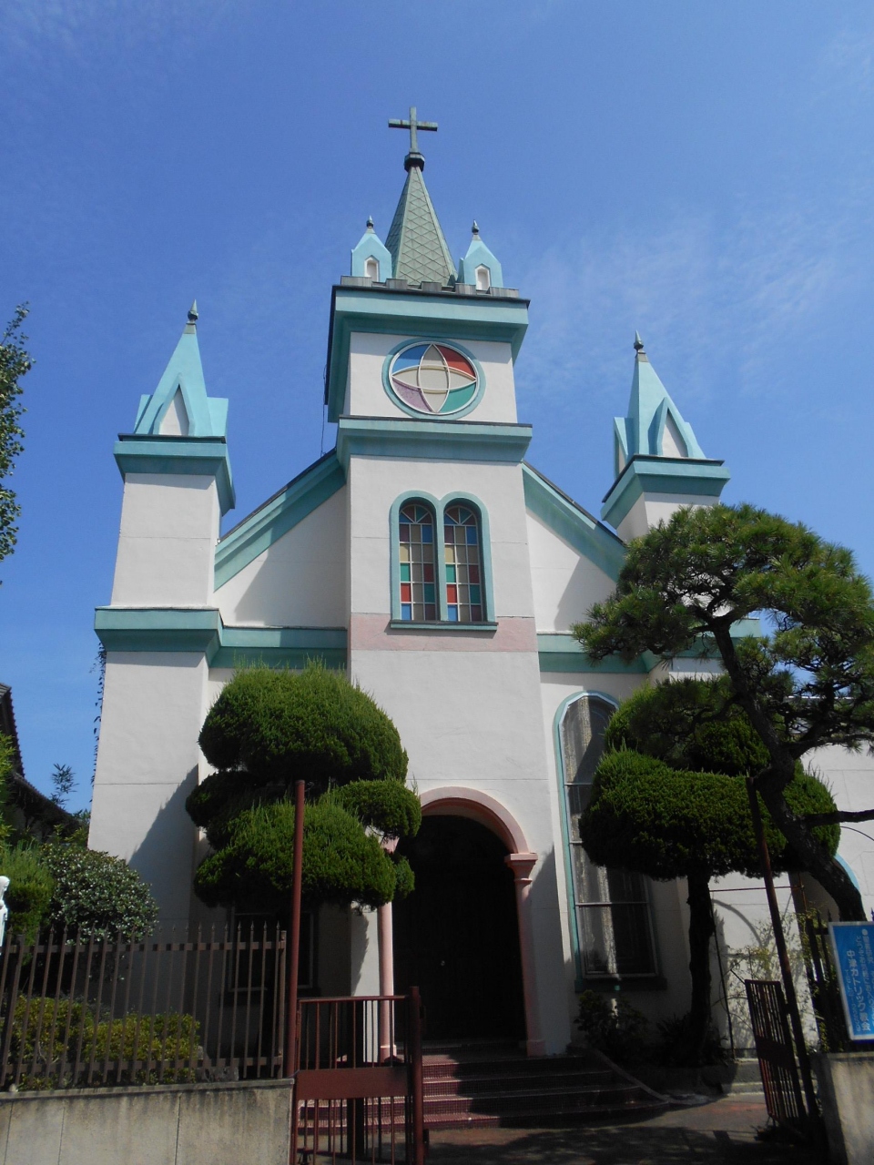 中津城の手前、南小学校の隣り、武家屋敷らしき和風建築の隣りに見える何とも奇妙な建物は青と白、塔が風景にインパクトを与えている。建築は80年前の建築。内部のステンドグラスが見応えあるそうだが、中に入れなかった(通常は日中開放)。