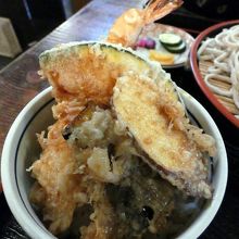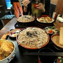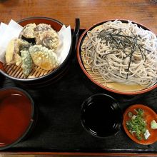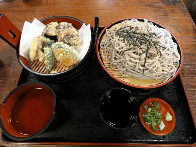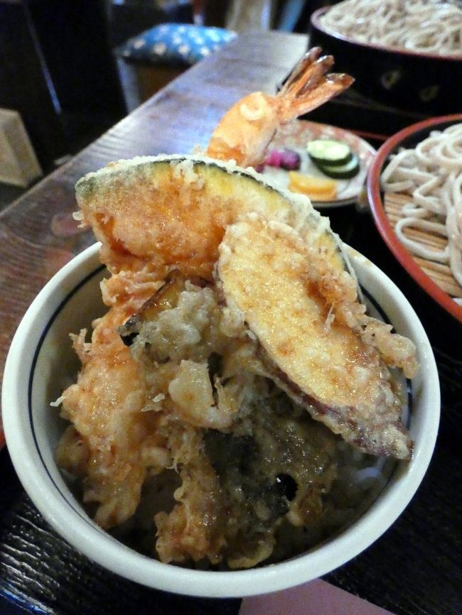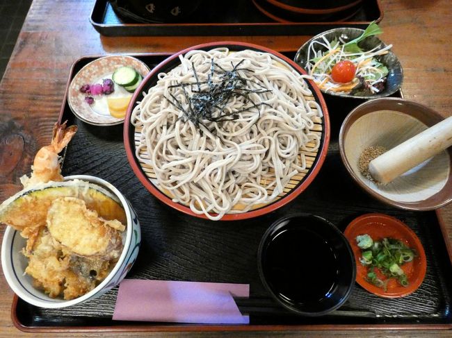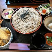この日私が食べた平日限定ランチ(¥940-)は、ざるそばに天丼とサラダが付いて、ボリュームたっぷり。