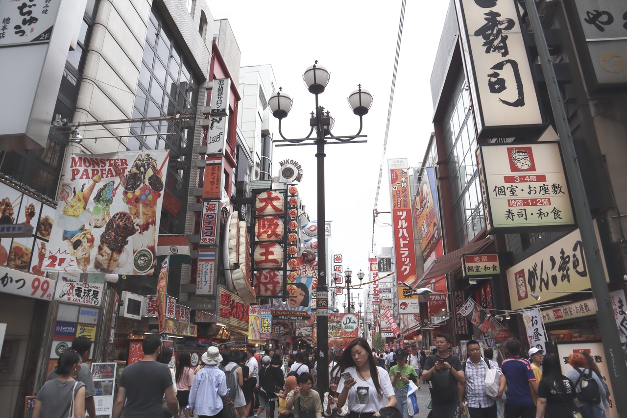 地下鉄なんば駅から歩いて数分で着きました。天気が悪くても観光客で大変賑わう場所でした。かに道楽やグリコなど巨大な看板がランドマークとなっています。かに道楽のゆるキャラまでいました。観光客があちこちで記念撮影をしています。