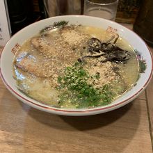 熊本の通町の中心から少し離れた路地にある店。夜18時からの営業なので23時ぐらいでもかなりの行列。カウンター15席程度だが、回転は良い。あっさりトンコツにニンニクが入った熊本ラーメンでチャーシューが薄切りでちょうど良い。