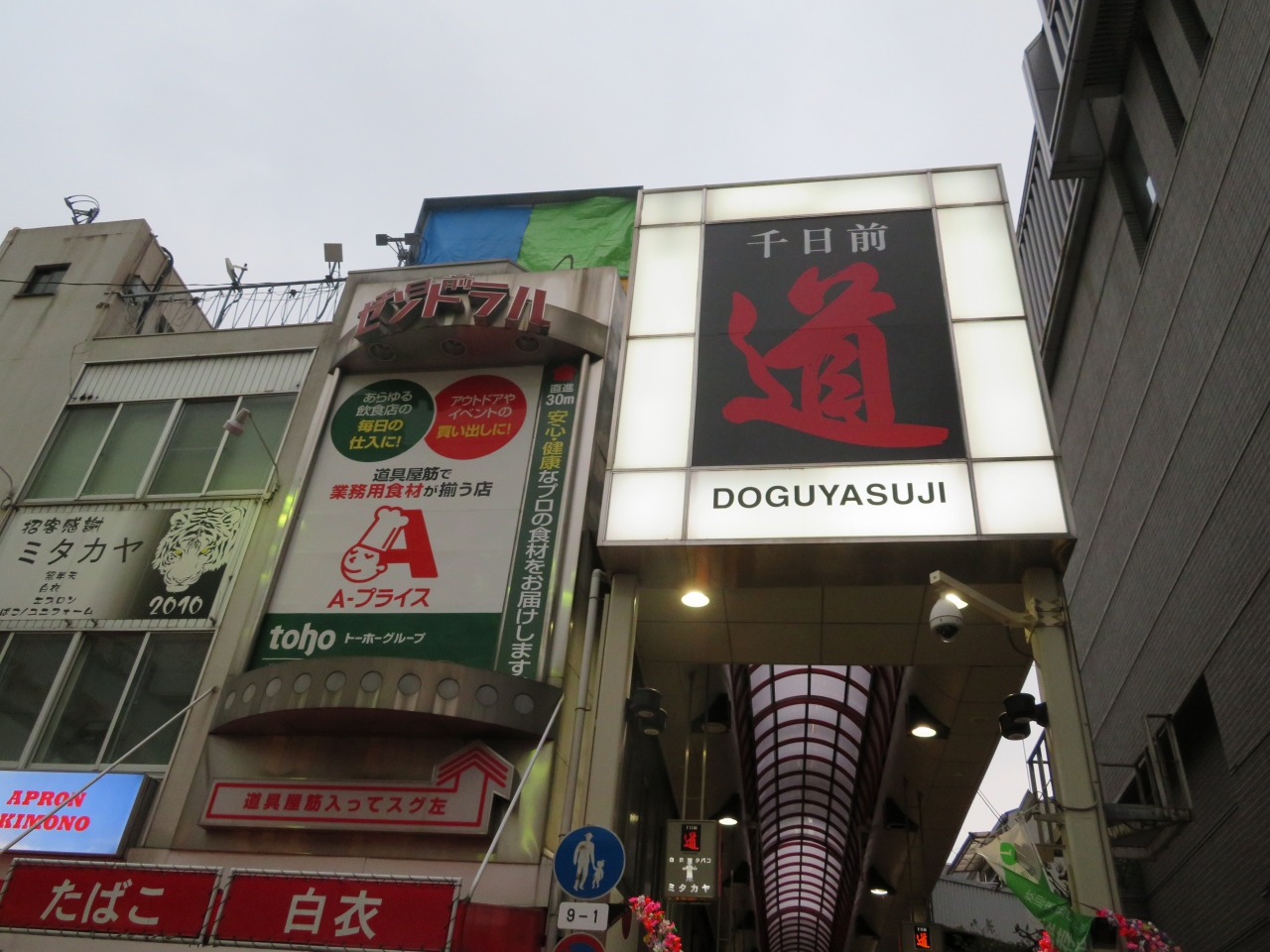 わりとわかりにくいのですが、入口の看板に、千日前の下に「道」と書いてあります。その下にローマ字で「DOGUYASUJI」とあります。難波の中でも1番昭和の雰囲気が残っている商店街です。陶器店だけでなくユニフォーム店のような懐かしい店もあっていい雰囲気です。