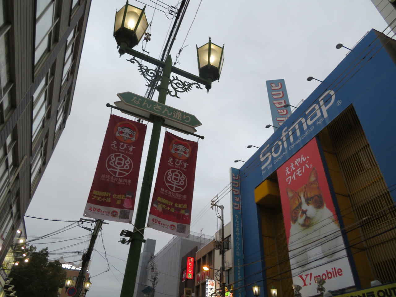 高島屋から続く通りで、レストランやマッサージ店などがズラっと並んでいます。人通りや車の通りが非常に多いので、車いすは危ないと思います。なんさん通りの看板の上に、大阪の橋によくあるレトロな街灯があって、これがいい雰囲気です。