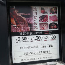 近江牛が食べ放題で食べられます。食べられる部位や種類によって金額が変わりますが、一番安い3500円でもそこそこ堪能できます。そのほか4500円、5500円、7000円の食べ放題もあります。私はまだ7000円の食べ放題は食べたことないですが、美味しい刺身とかも食べられるみたいで一度トライしたいと思っています。もちろん飲み放題も別料金ですがあります。