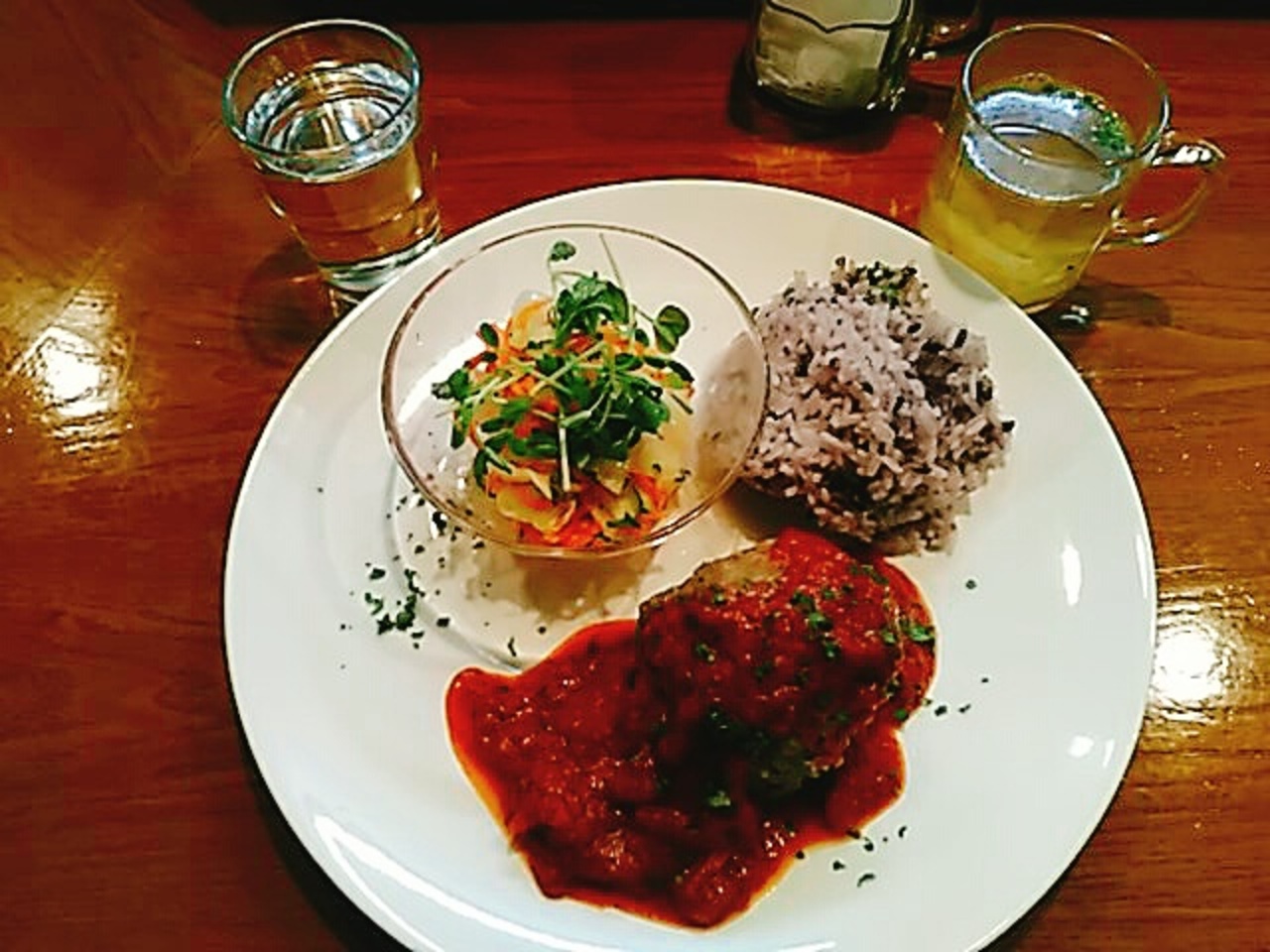 東二番丁の一本東側の通りにあります。行った時、お昼の時間で7割位の入りでしたが、女子率高いです。行った日のランチは日替わりのトマトソースのハンバークか、週替わりのきのととピーマンのカレーでした。今回はトマトソースのハンバークをお願いしました。ハンバークはニンジンが結構いっぱい入っていて新鮮でした。ご飯は五穀米で芳ばしかったです。スープは玉ねぎトロトロスープでした。