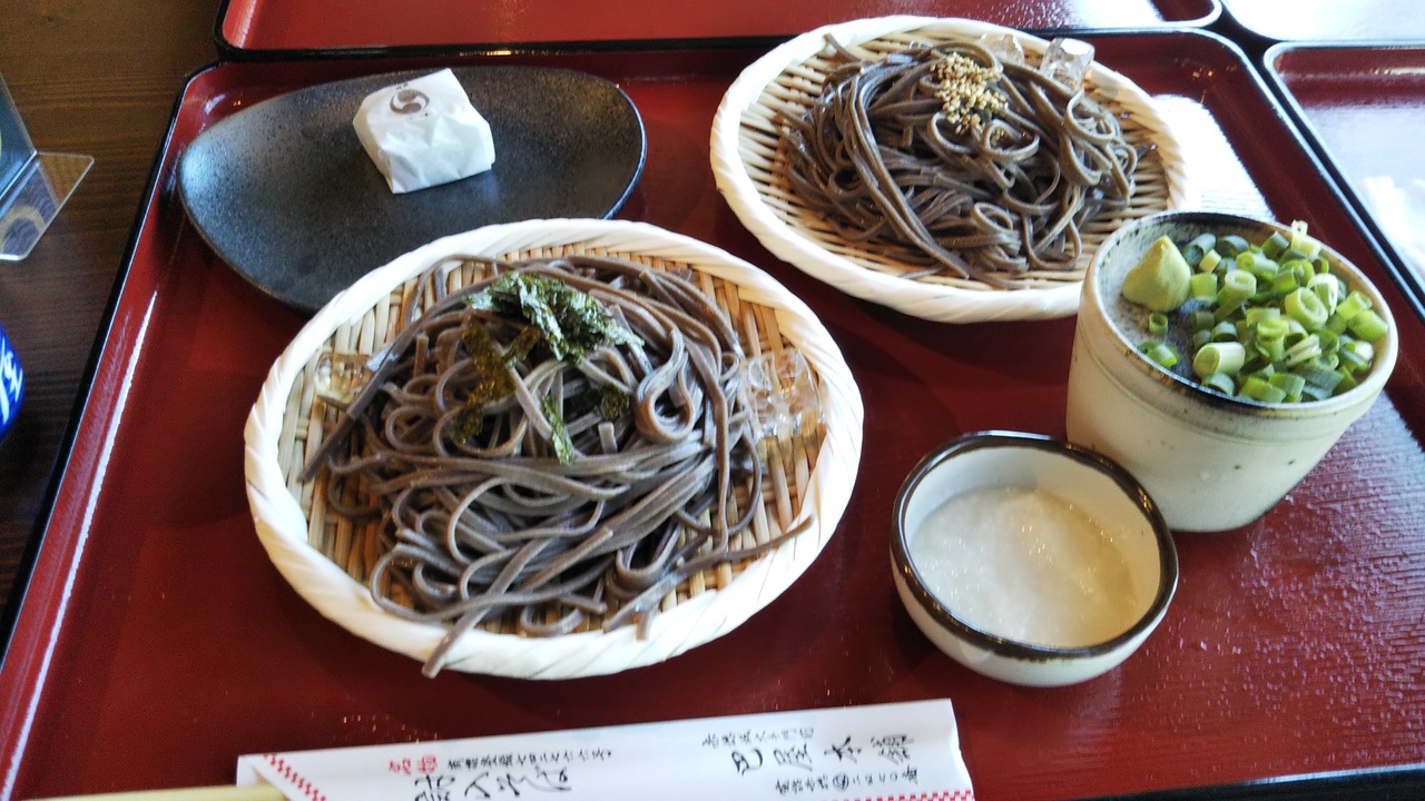 赤穂城の大手門の前にある和菓子屋が、そばも提供していました。和菓子屋で注文してからそばを茹でるので待ちました。討ち入りそばと名付けられたざるそばは、平たいそばにごまと海苔がのった二種類に盛られ、薬味のとろろと一緒にいただきました。