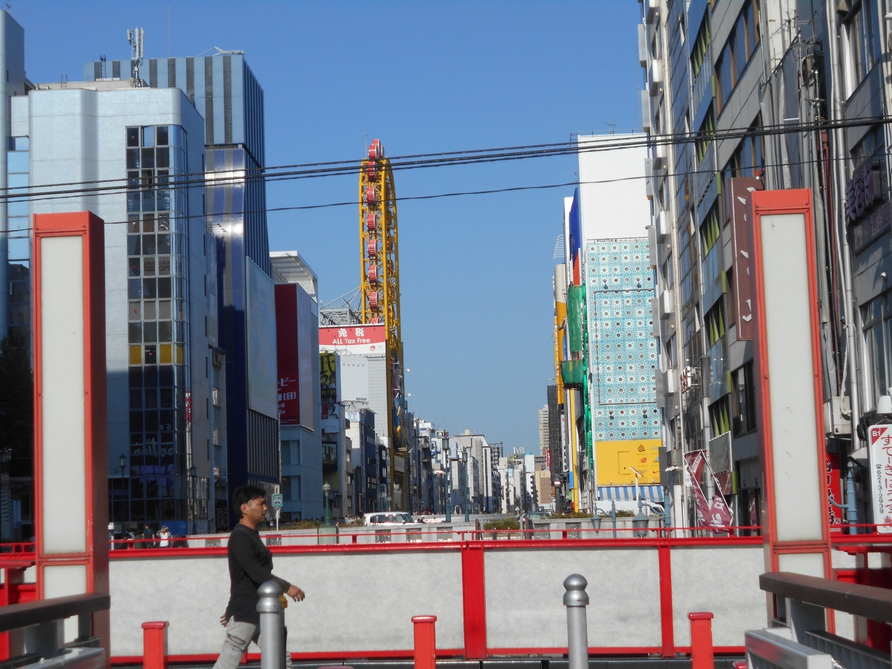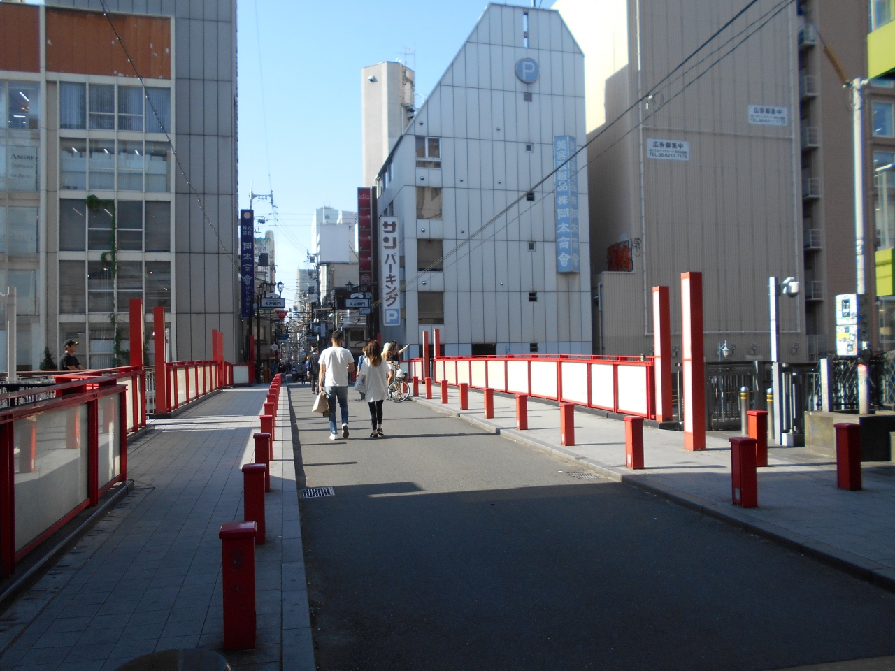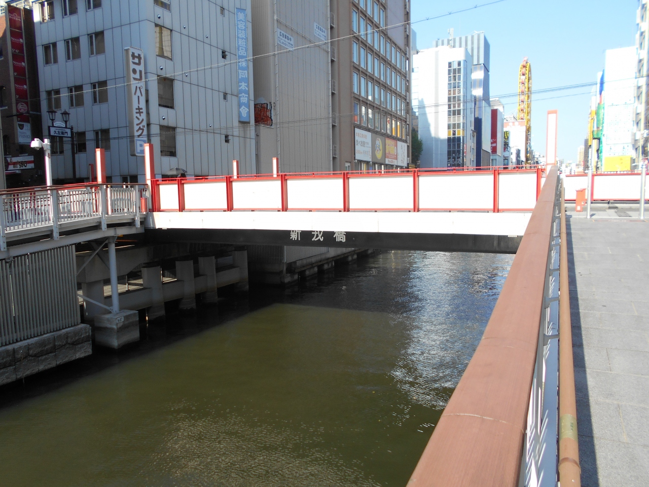 御堂筋の西側で道頓堀川に架かる橋で朱色の縁取りが可愛らしいです。御堂筋東側の戎橋とは打って変わった静けさです。飲み屋街の久左衛門町と九朗右衛門町を結ぶ通りの橋で橋長39.75m、幅6.96mの桁橋です。難波八百八橋と言われる多くの橋の一つです。