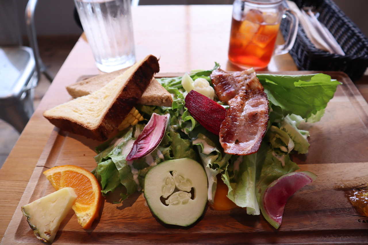 泊まっていたホテルは朝食なしプランだっため、朝早くからやっているカフェを探していて行きました。北浜駅の地下鉄出口からはすぐの場所です。モーニングプレートは野菜たっぷりでヘルシーで美味しかったです。7時過ぎだったのでまだ店内は空いていて静かに過ごせました。