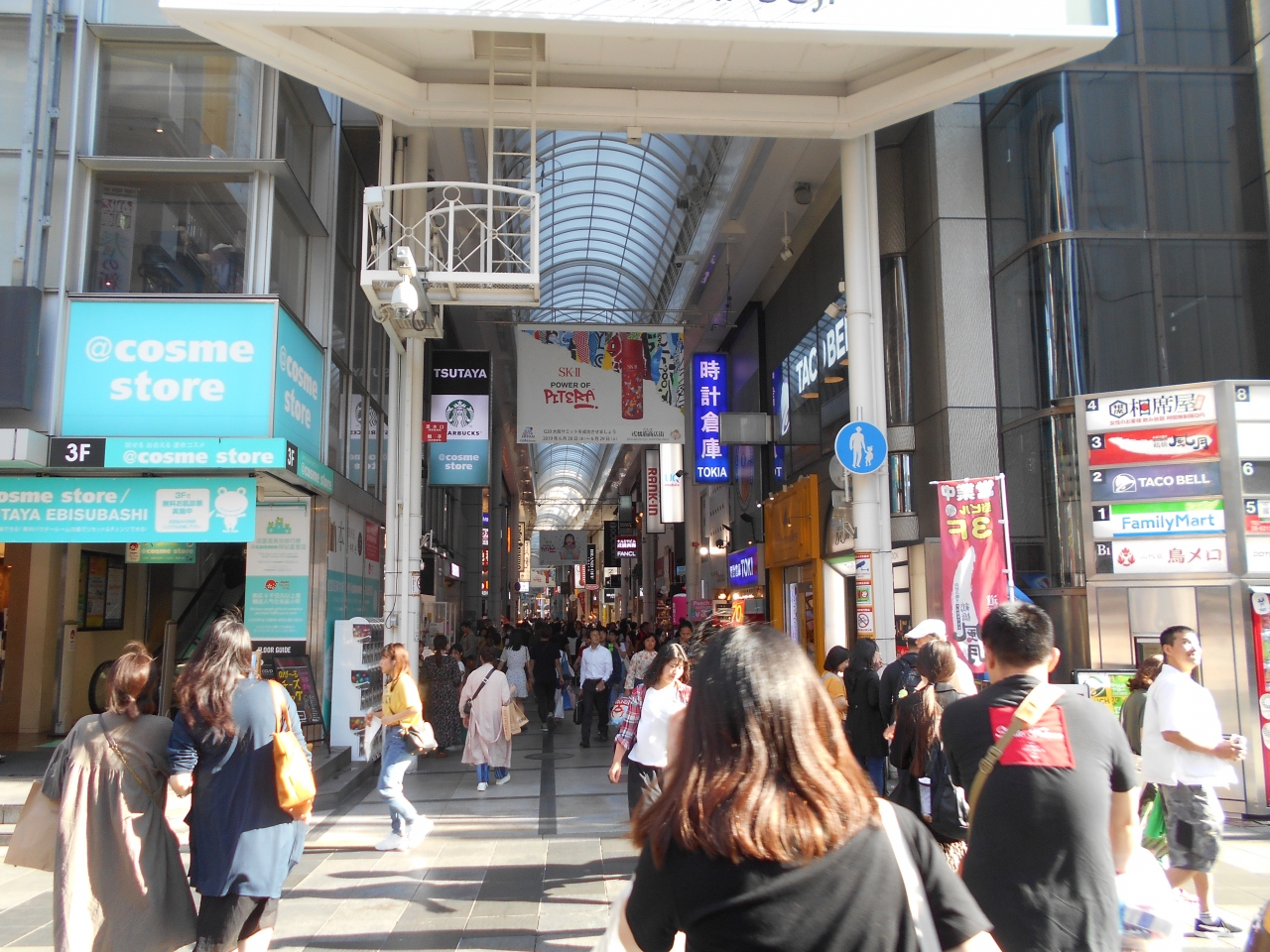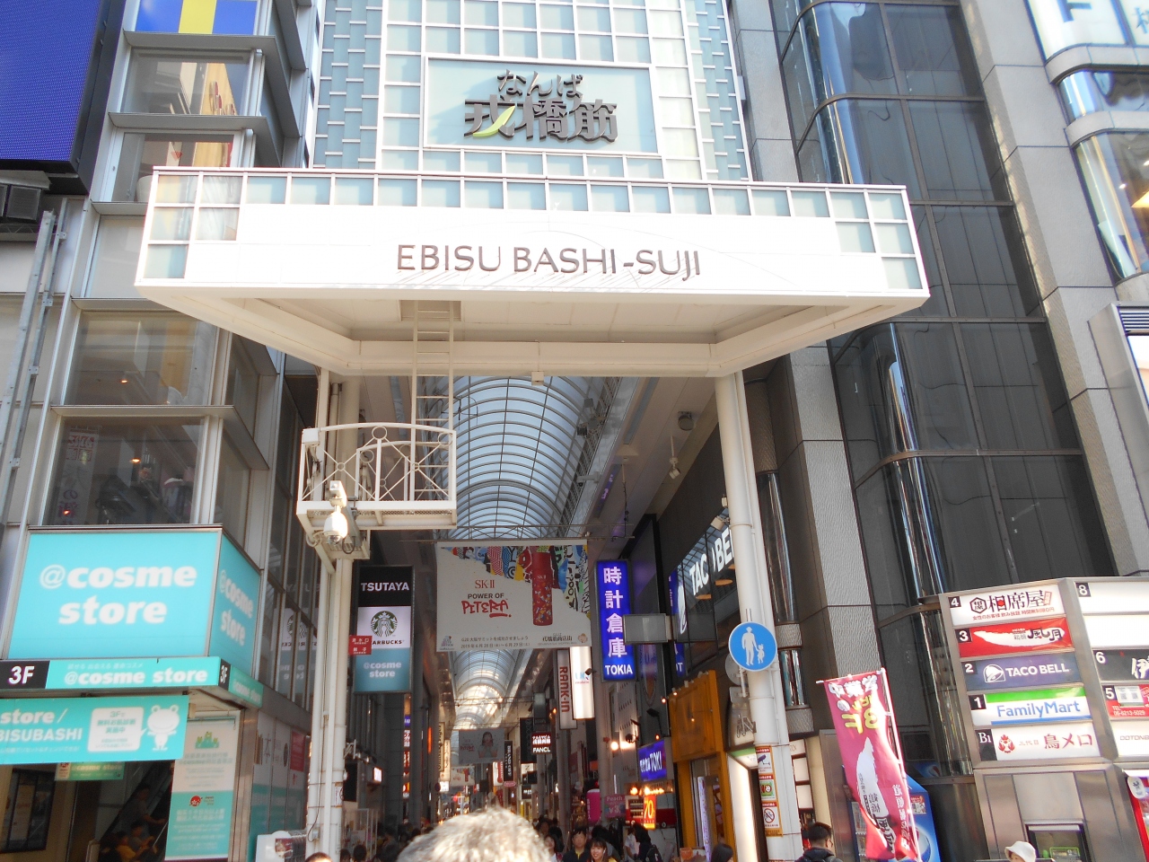 かに道楽とグリコの看板で人気の戎橋の南詰から難波高島屋まで続く商店街で大阪ミナミのど真ん中を通るアーケード商店街です。江戸時代この筋を通って今宮戎に向かう人々のために茶屋やうどん屋を開いたのが始まりとされる由緒ある商店街です。今は海外の観光客で賑わっています。