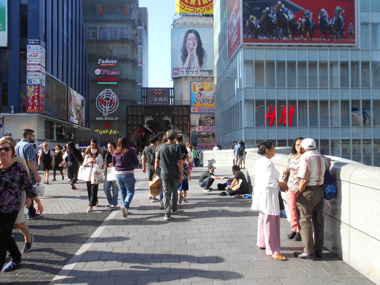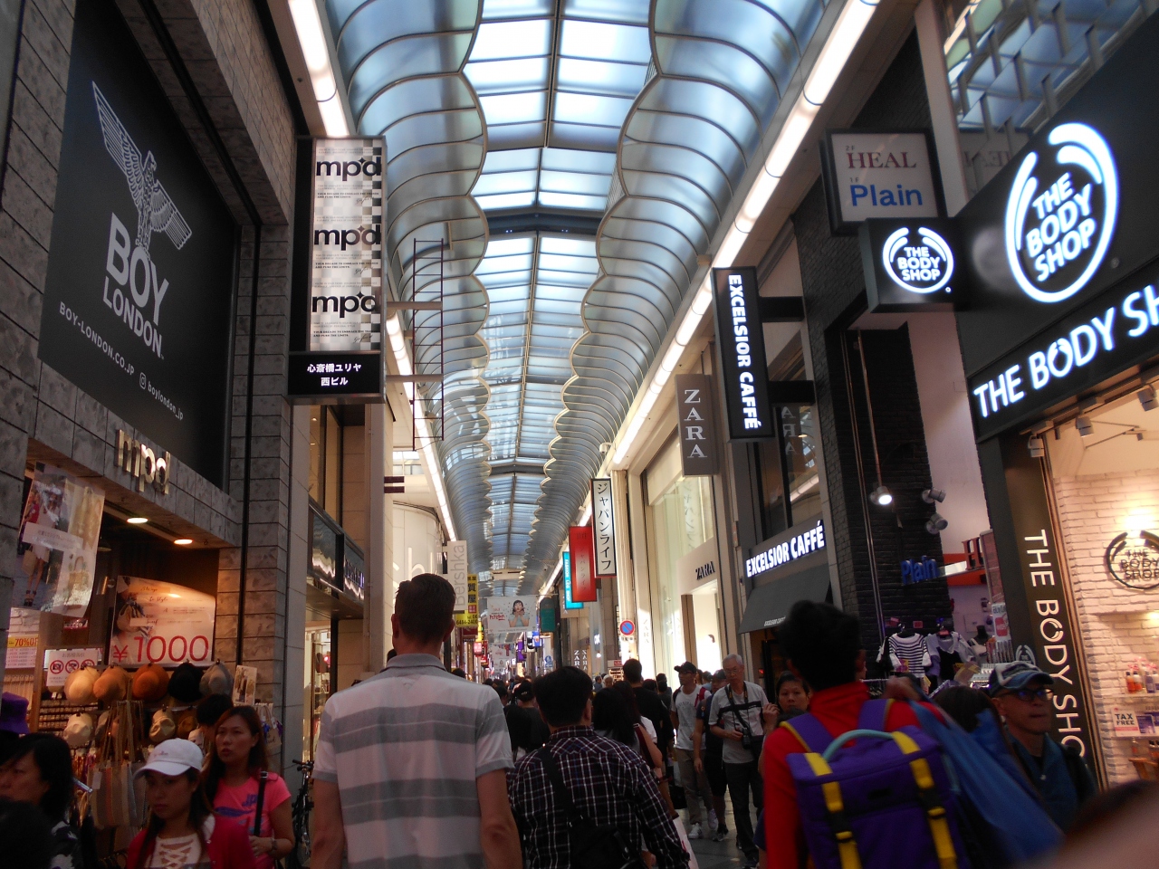 大阪ミナミを代表するアーケード商店街で心斎橋大丸から戎橋北詰までの580mのファッションから飲食店が充実した街です。中国、台湾、韓国などの海外観光客が多く買い物ををして賑わっています。戎橋からの流れがコースのようになって大混雑です。今は韓国客が少なくなっているようですが。