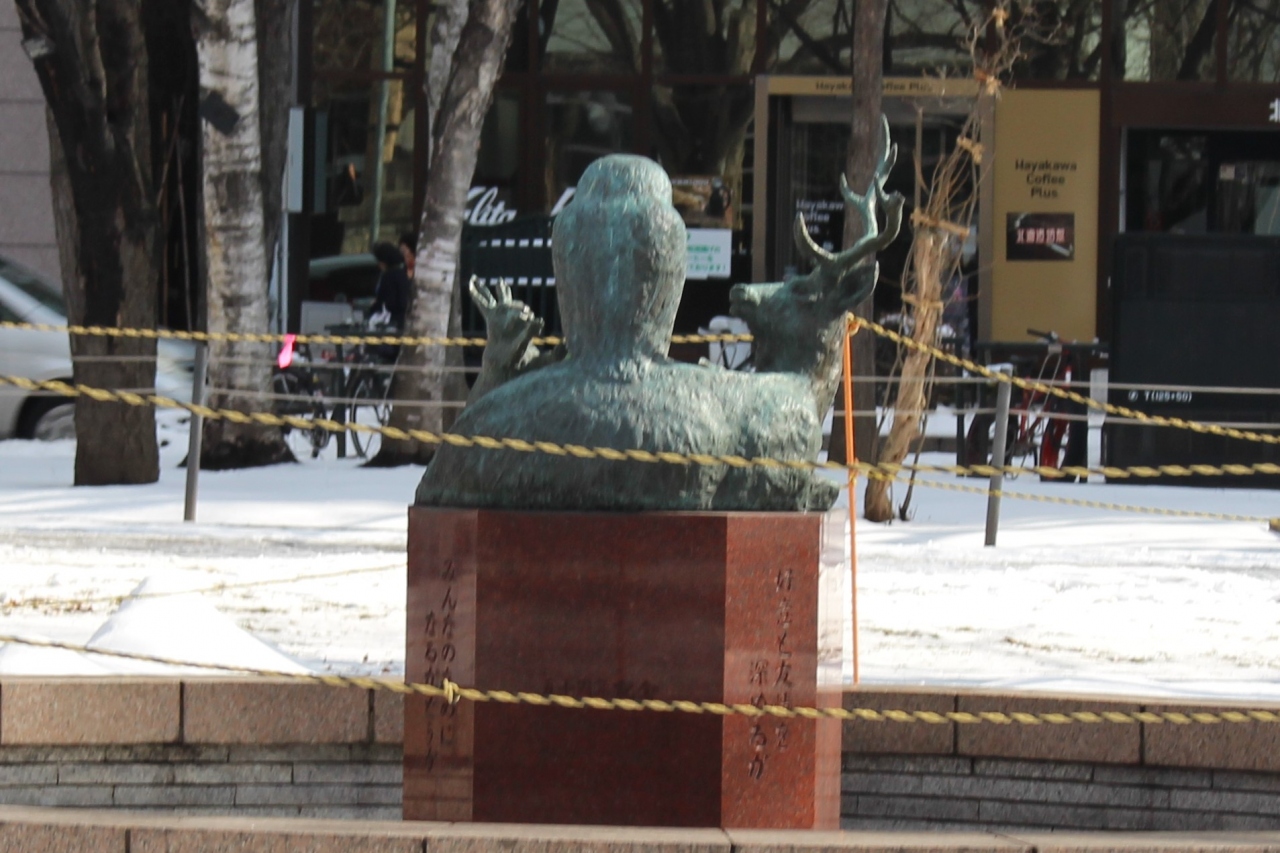 北の大地、北海道の札幌市の観光スポット大通り公園にはいくつもの彫刻オブジェやモニュメントがあり、そのなかのひとつです。奉仕の道は札幌ロータリークラブが50周年を記念して建てられたそうです。動物たちの像でエゾフクロウに、エゾシカ、ハシブトガラス、エゾウサギがよりそって耳を傾けていました。 精巧な造形で動物たちがかわいらしいモニュメントでした