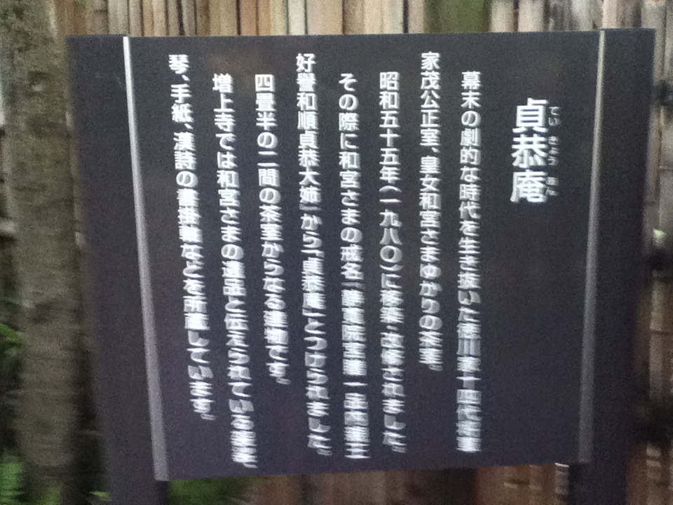 貞恭庵は増上寺の大殿の裏手にある茶室である。数人が来ていた。お勧めの点は、徳川家14代将軍家茂公正室、皇女和宮ゆかりの茶室であること、昭和55年(1980)に移築、改修され、その際、その際に和宮の戒名から貞恭庵と名付けられたこと、茶室は四畳半の二間の建物であること、茶室に関心のある人は訪問する価値があることである。訪問時の感想は、増上寺境内に茶室があることを初めて知り、また趣のある白い壁のこじんまりとした茶室を見ることができ訪問して良かった。