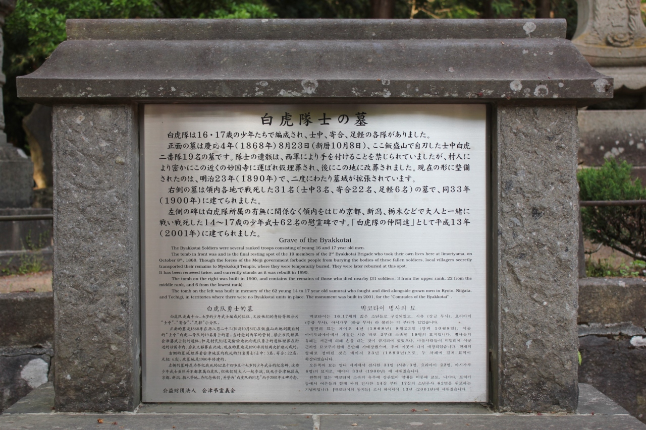白虎隊士が飯盛山で自刃した後、新政府軍がここに埋葬することを許さず野晒しだったため、一旦近くの妙国寺に仮埋葬されましたが、後に許可されたためここに埋葬され、お墓は鶴ケ城に向いて安らかに眠っています。