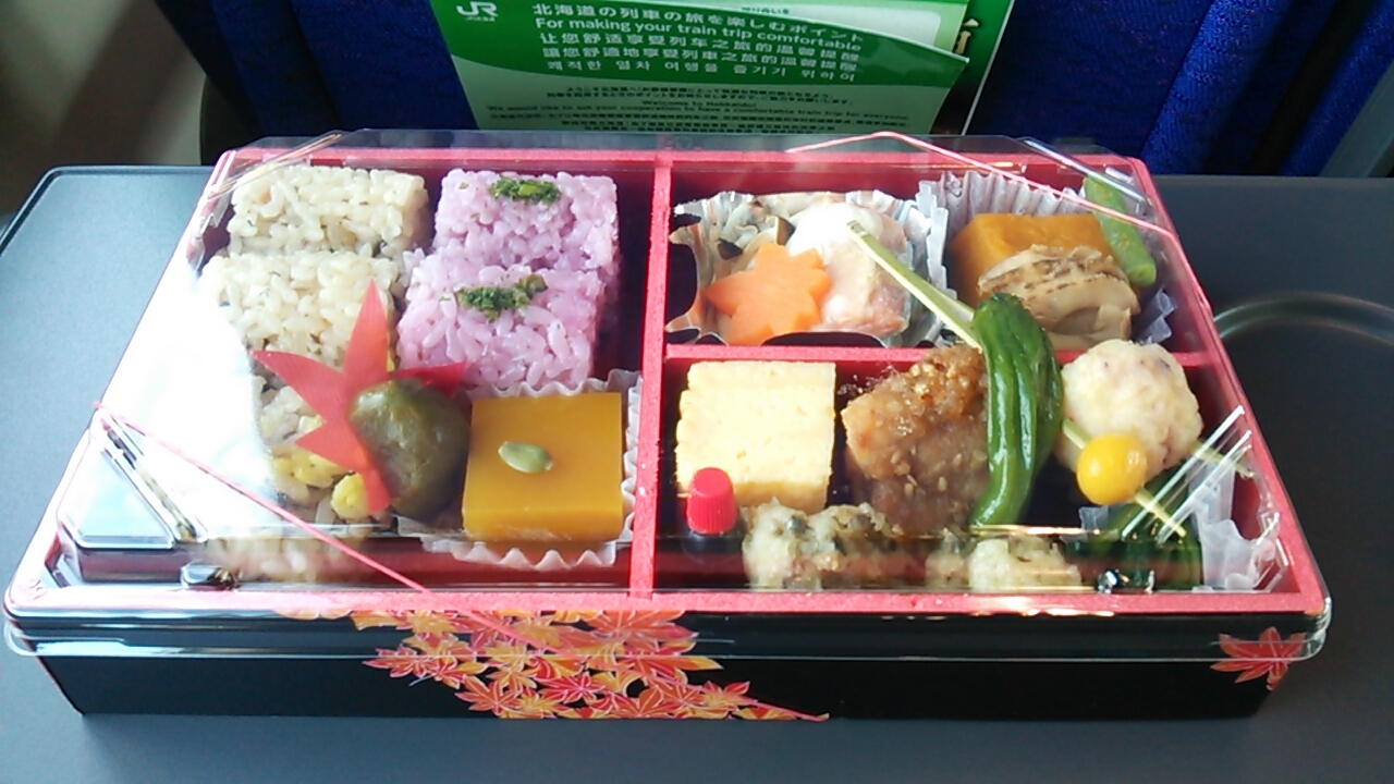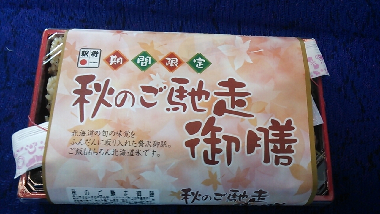 当日は1080円する「秋のご馳走御膳」という駅弁を頂いたのですが、道産秋刀魚とひじきご飯&道産ハスカップご飯の他、道産秋鮭のチーズチャンチャン焼き、知床鶏の南部竜田揚げ、道産帆立と南瓜の炊き合わせ等北海道産の食材を使用した料理が9品盛られていたので、いろんな料理を楽しめた点で満足しました。