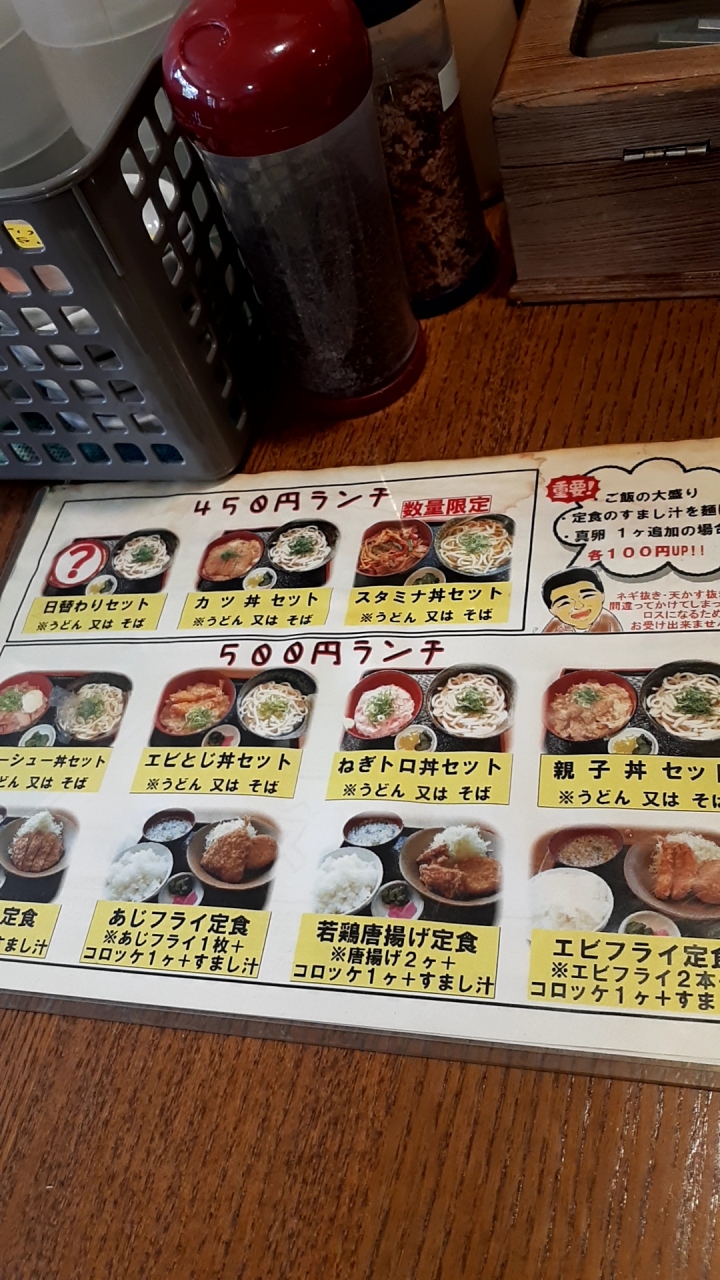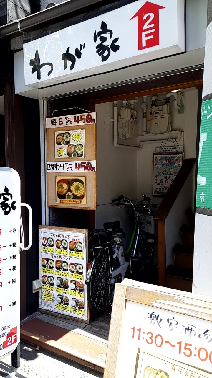 階段の出入り口には、お昼の定食メニューの看板があり、450円と500円のランチメニューが並んでます。