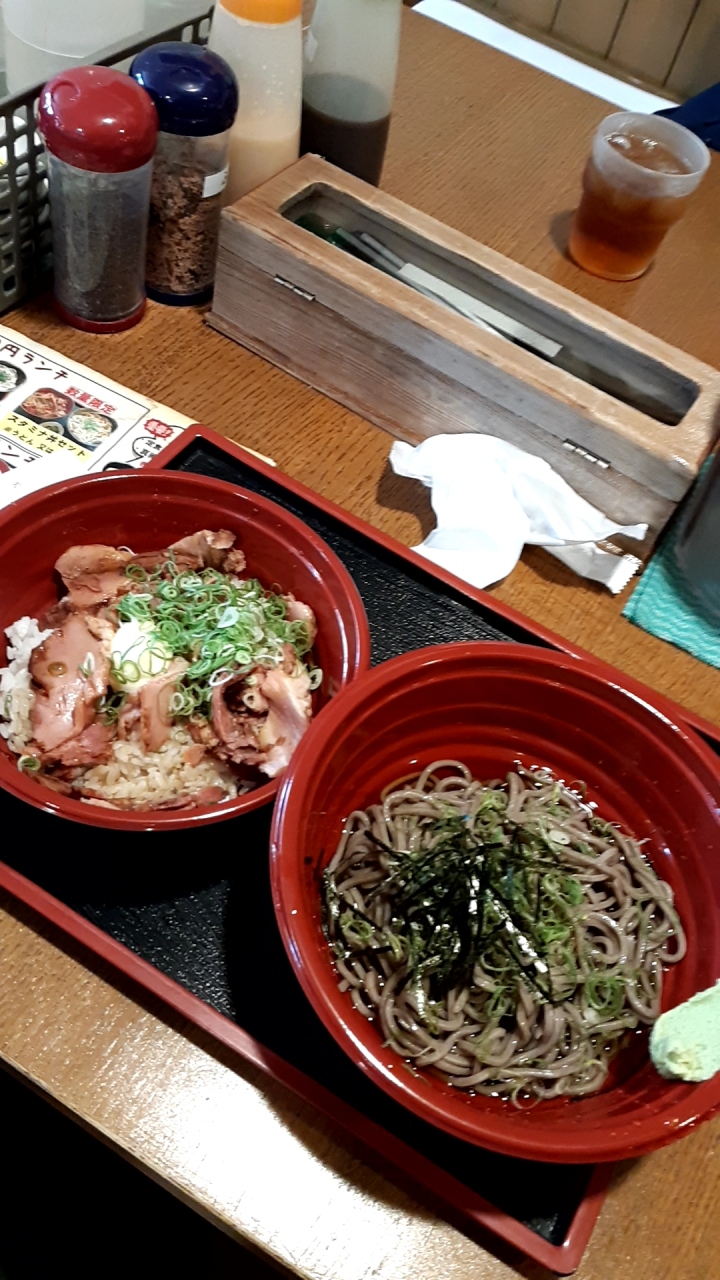 今回、450円のチャーシュー丼定食を選びました。うどんとそばを選べるのでそばを注文。冷たいそばも用意できるとのこと。