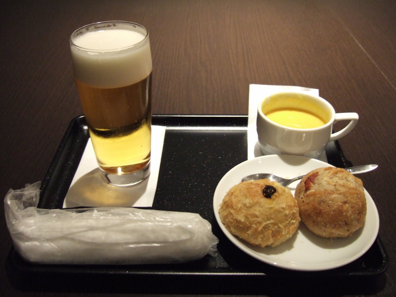 羽田発の便をファーストクラスにアップグレードし、ダイヤモンド・プレミアラウンジを利用しました。スープは8月と違い、かぼちゃのスープになっていましたが、おにぎりは鶏そぼろと梅しそ金胡麻で同じでした。平日の夜だったので意外と混んでいました。