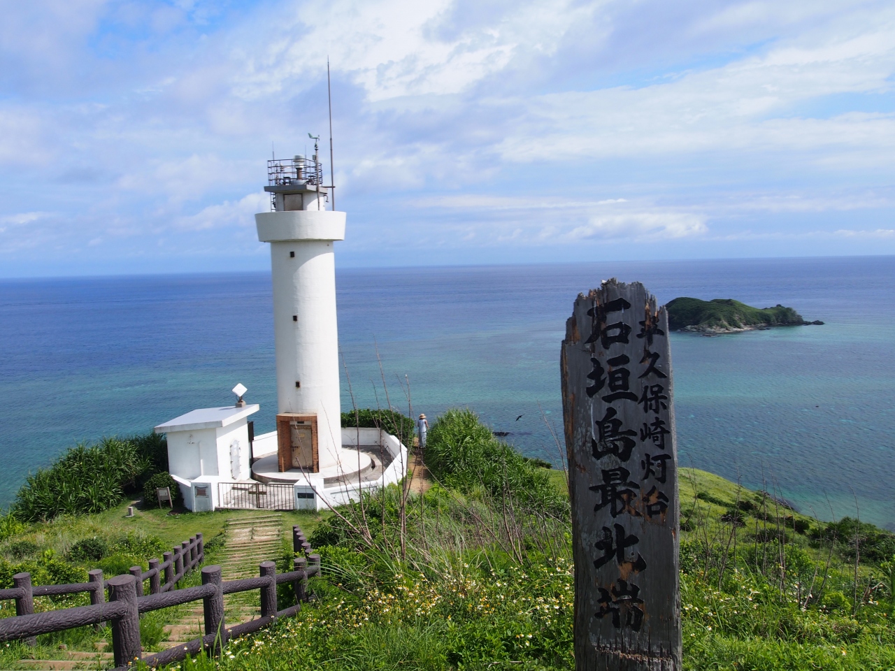 石垣島1周ドライブ。初めに平久保崎を目指しました。幸運なことに快晴でドライブ日和。どこまでも続く海は美しく,真っ白な灯台が,空の水色,海の青,緑の木々に映えて,最高のロケーションでした。是非晴れた日に訪れたい場所です。