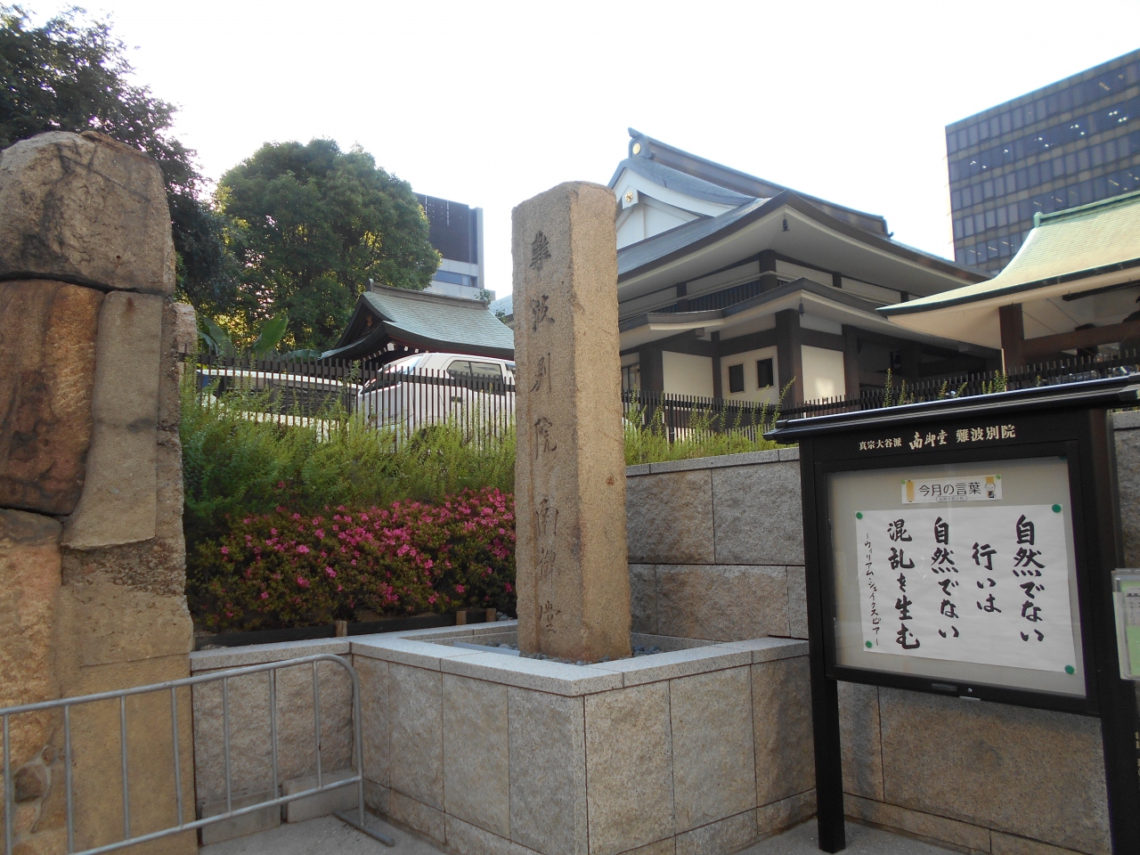 御堂筋西側沿いで本町駅の南に建つ浄土真宗大谷派寺院。本町通北に建つ北御堂と繋ぐ道として御堂筋と名付けられた由緒ある寺院です。境内は広く会館を解体して2019年に完成するシティホテルへの工事の真っ最中でした。寂しいことです。芭蕉の句碑も綺麗な庭園に建っています。
