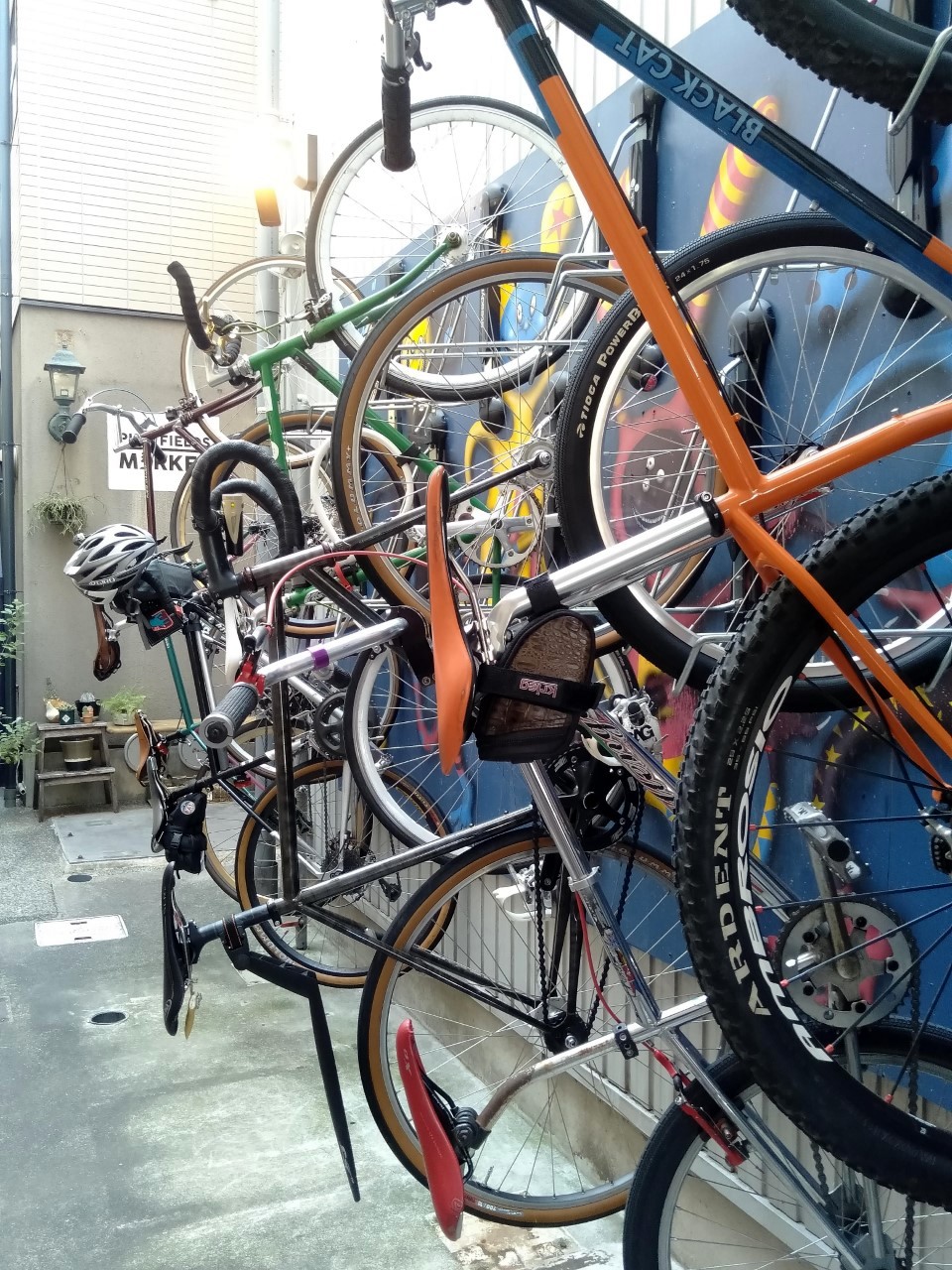 大きな自転車屋さんの隣にお店に行くための細い路地があります。