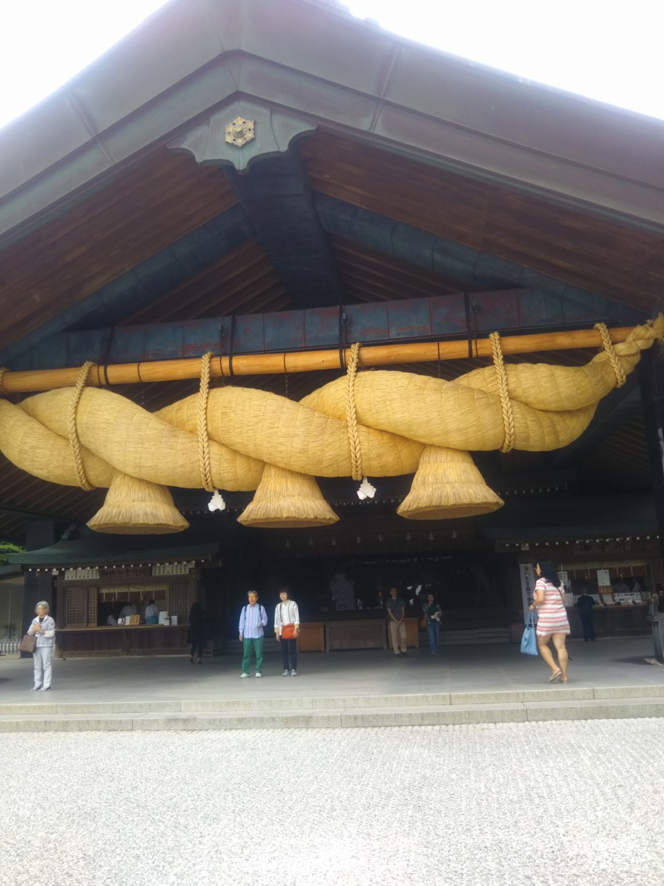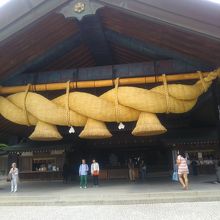 本殿をお参りした後に立ち寄りました。徒歩2~3分の場所に神楽殿があります。日本一の大きさのといわれているしめ縄があります。本当に大きいです。建物は昭和初期に作ったものだそうです。宮司家の大広間として作られましたが、今ではさまざまな行事で使用されています。