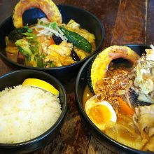 ザンギ、ハンバーグなどのカレーメニュー、バラエティの多いラッシーなど、他とは少し違いがあるメニューで選びきれません。