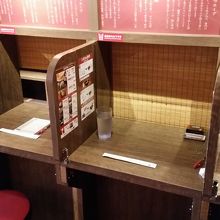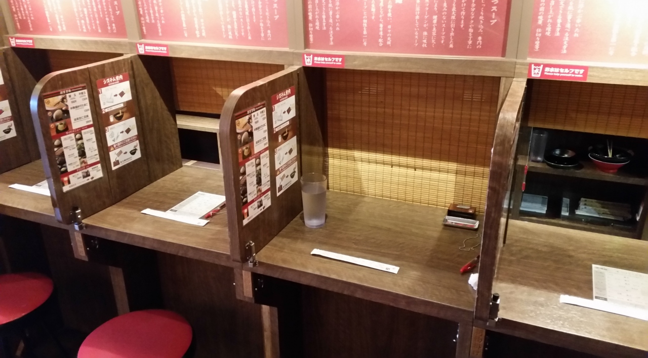 朝食として無性にラーメンが食べたくなり,24時間営業の同店に入店.一蘭さん自体が初めてであり,同店のシステムは知りませんでした.平日の朝でもあり,私を含めてお客は3人でした(掲示パネルで空席状況がわかるようになっている).味集中カウンターなる,一杯のラーメンを食することに集中できるようにカウンター席が個々に仕切られていました.また,座席前面には簾が垂れており,注文する際には呼びボタンスイッチを押すと店員さんが簾を少し上げて対応してくれます.ですから,店員さんのネームプレートは分かりますが,お顔を拝見することはありません.あらかじめ券売機で食券を購入し,着席したらオーダー用紙に好み(麺の茹で方,背油の量,にんいくの量,チャーシューの有無など)を書き込んで店員さんを呼びます.面白いシステムであり,個人的には好きになりました.