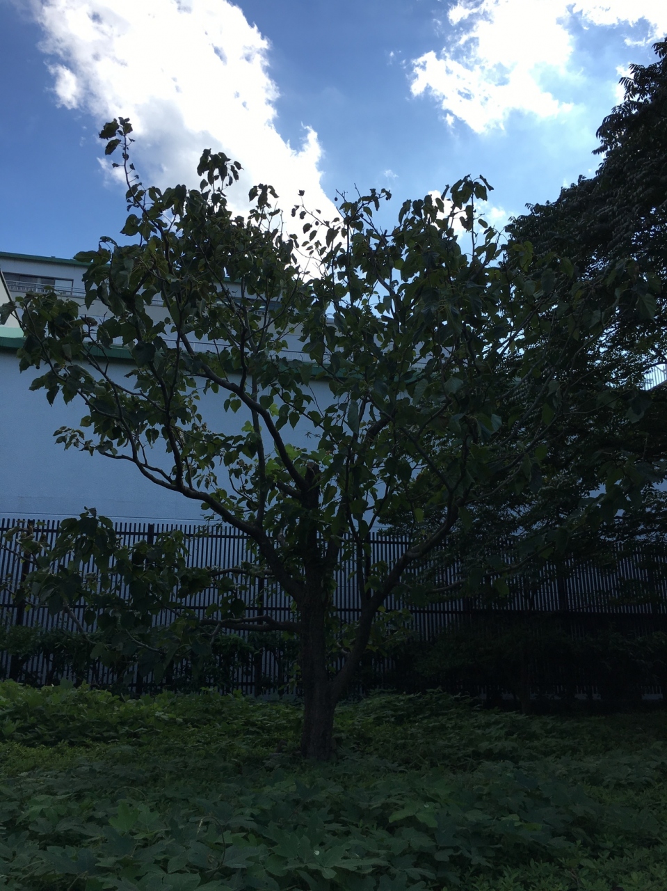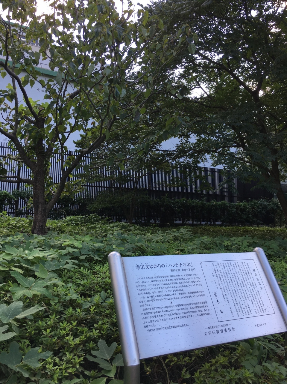 礫川公園内の草が生えたエリアにあり近くには行けなく、少し離れたところから見学です。細い枝からいくつも枝がわかれていてどこにでもあるような木でした。説明看板があるので目を引きますが特に特徴がない木でした。