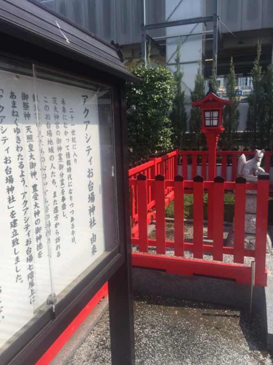 アクアシティお台場の七階屋上エリアにある小さな神社です。規模は小さいですが、ちゃんと鳥居や祠もあります。芝大神宮からの分霊と、ちゃんとした神社になります。