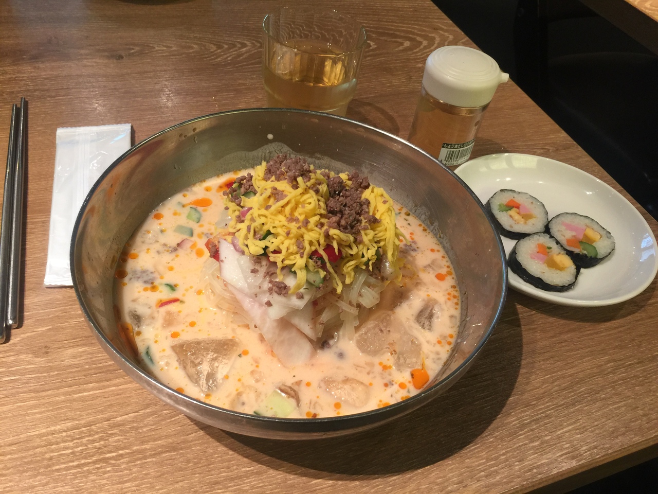 食べたのは豆乳坦々冷麺1,080円に大盛プラス100円!これ美味いんだよな。お酢とバンチャンのキムチを入れてナイス!