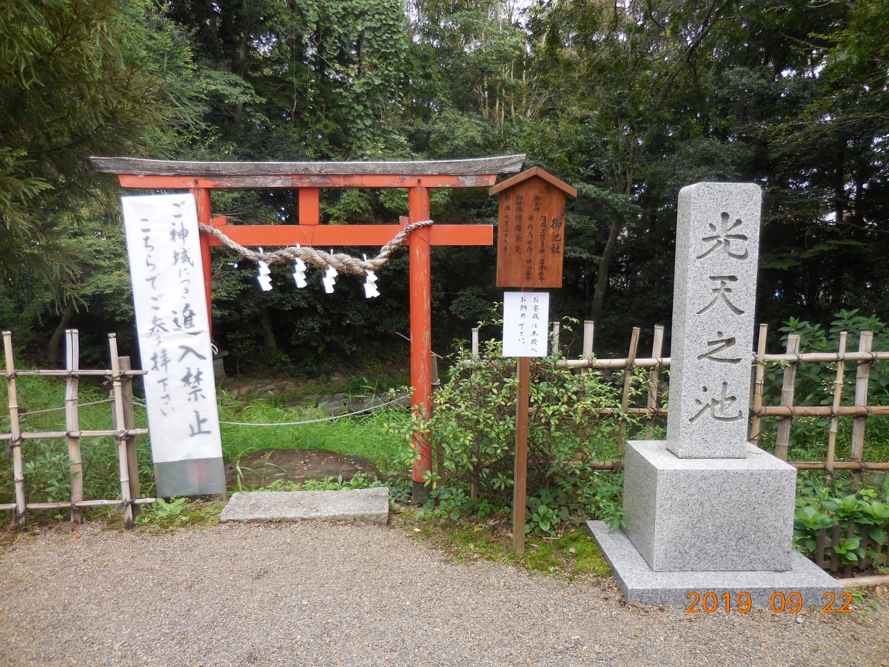 境内には龍神様の「光天之池」や平成天皇もご覧になったという「神楽殿」、「八幡神社」や他にもたくさんの神社が点々と。たくさんの神様にご挨拶することが出来ます。