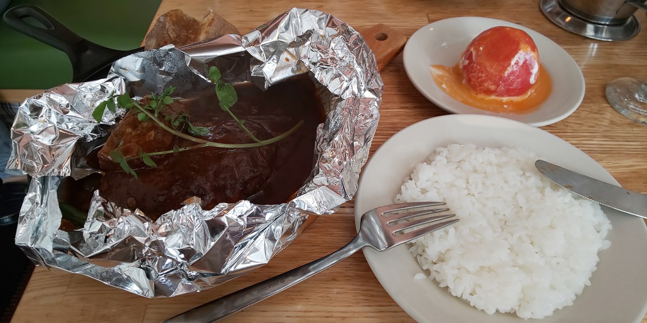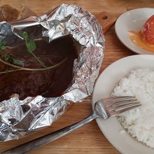 アルミホイルをカットすると熱々のデミグラスソースハンバーグがお出ましです