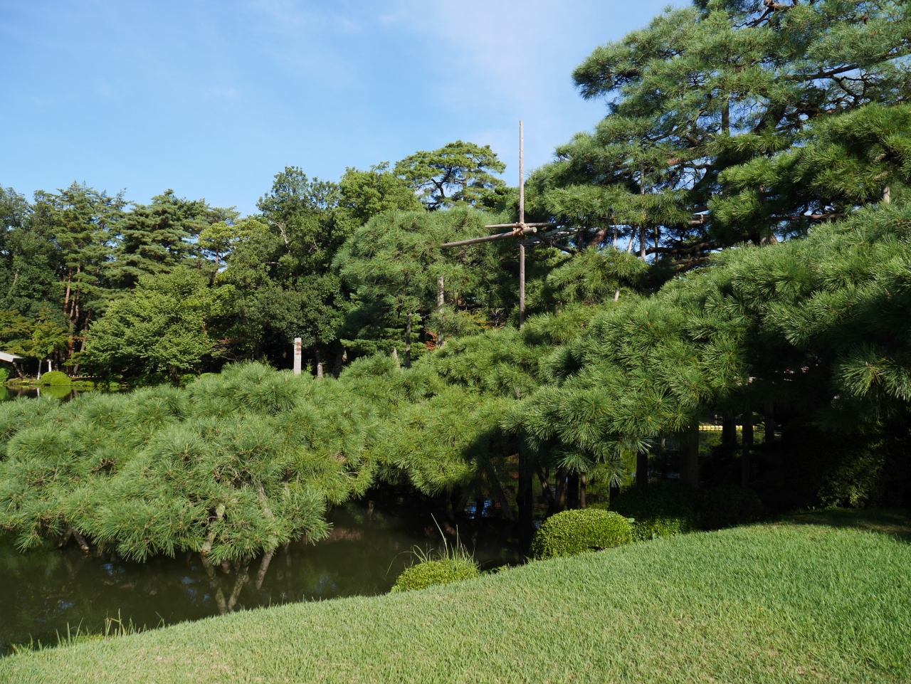 霞が池の一角に植えられているクロマツです。枝が低く池を覆うように広がっています。