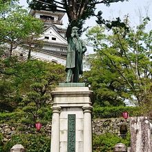 現存天守12城のひとつである高知城の追手門をくぐった先に、左手を腰に右手をあげる姿の大きく立派な銅像がありました。銅像の前まで行くにはちょっと長めの階段がありました。階段の下から写真を撮りましたが高知城天守が背景となりました。
