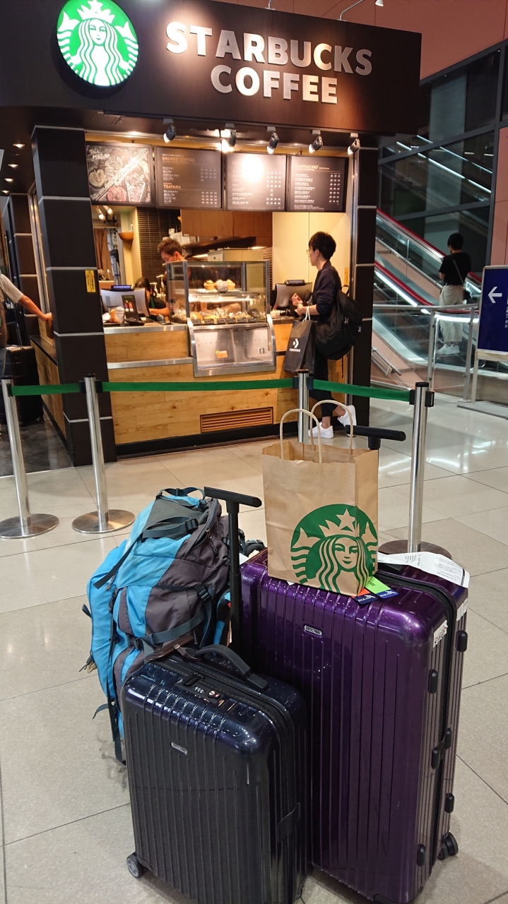 南ゲート出てすぐに左側ある小さなスタバです。(北ゲートの同位置はドトールです)いつも南ゲート利用便なので、帰国後のホッと一息、そしてこれからの市内までのドライブのお供にいつも利用しています。空港限定のボトルやマグなども売っていました。
