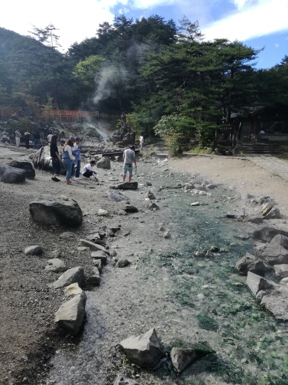 しばらく坂を下ると、西の河原公園があります。観光客がそれぞれ足湯に入ったり、写真を撮ったり、石を積んでいたりと賑わっていました。