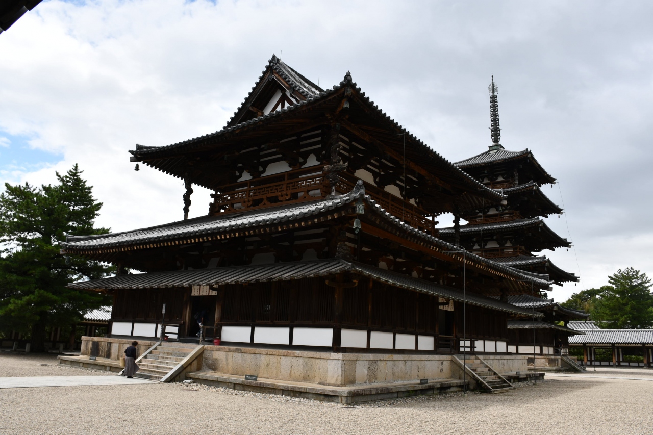 五重塔と並び立つ、西院伽藍の中心です。一千四百年もこの地に建ち続けているということが信じられないぐらいの有り難さです。今回は特別に、裏側から入って釈迦三尊像の両脇から拝観したりしました。聖徳太子の仏教に対する御心が受け継がれているように思います。