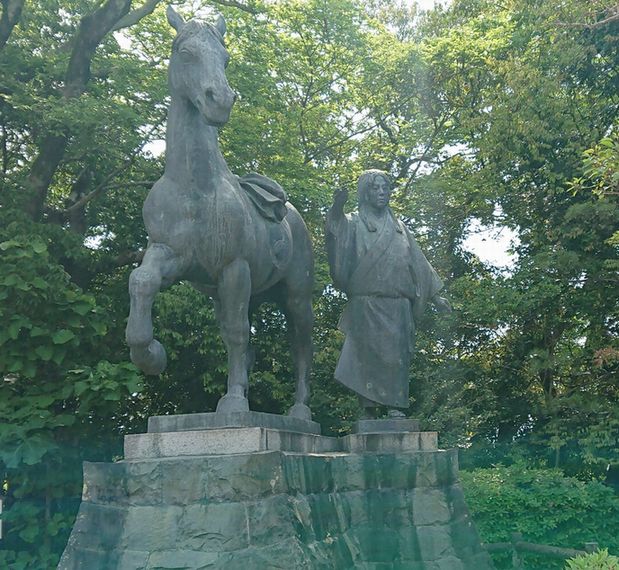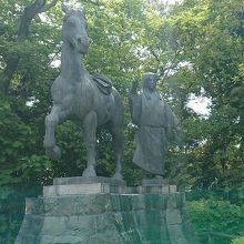 高知城を築いた初代土佐藩主の山内一豊、その妻千代は一豊を内助の功で支えたと伝えられています。名馬を持参金で購入した逸話があるので、それをモチーフにしたのでしょう。立派な馬とともに銅像になっていました。夫一豊の銅像は追手門前にありました。
